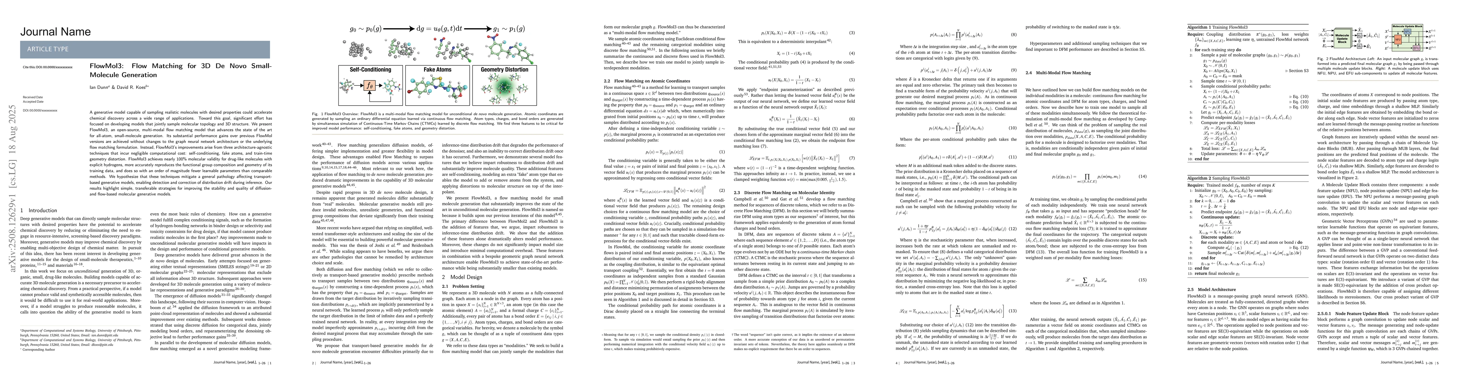 A generative model capable of sampling realistic molecules with desired properties could accelerate chemical discovery across a wide range of applications. Toward this goal, significant effort has focused on developing models that jointly sample molecular topology and 3D structure. We present FlowMol3, an open-source, multi-modal flow matching model that advances the state of the art for all-atom, small-molecule generation. Its substantial performance gains over previous FlowMol versions are achieved without changes to the graph neural network architecture or the underlying flow matching formulation. Instead, FlowMol3's improvements arise from three architecture-agnostic techniques that incur negligible computational cost: self-conditioning, fake atoms, and train-time geometry distortion. FlowMol3 achieves nearly 100% molecular validity for drug-like molecules with explicit hydrogens, more accurately reproduces the functional group composition and geometry of its training data, and does so with an order of magnitude fewer learnable parameters than comparable methods. We hypothesize that these techniques mitigate a general pathology affecting transport-based generative models, enabling detection and correction of distribution drift during inference. Our results highlight simple, transferable strategies for improving the stability and quality of diffusion- and flow-based molecular generative models.