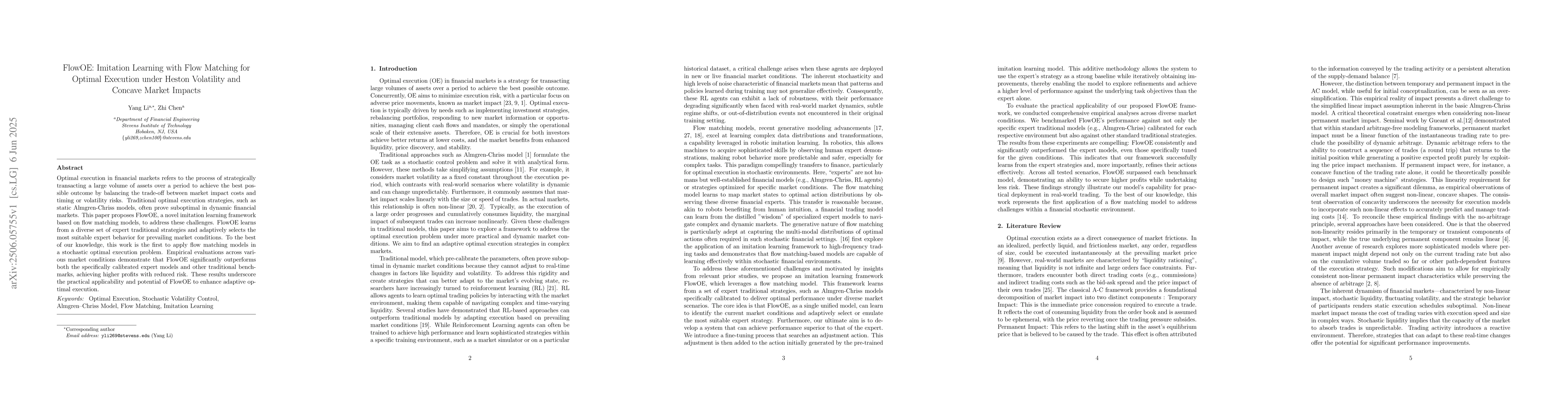 FlowOE is a novel imitation learning framework that improves upon traditional optimal execution strategies in financial markets by adapting to prevailing market conditions and incorporating a refining loss function.