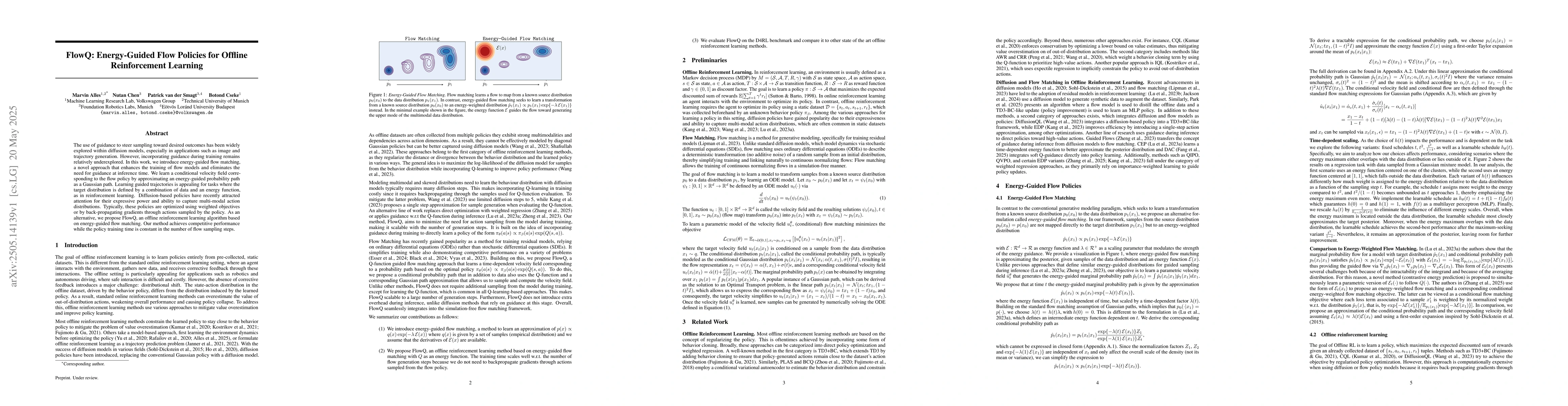 FlowQ: A novel offline reinforcement learning algorithm that uses energy-guided flow matching to train policies with constant training time, achieving competitive performance in tasks where target distributions are defined by data and energy functions.