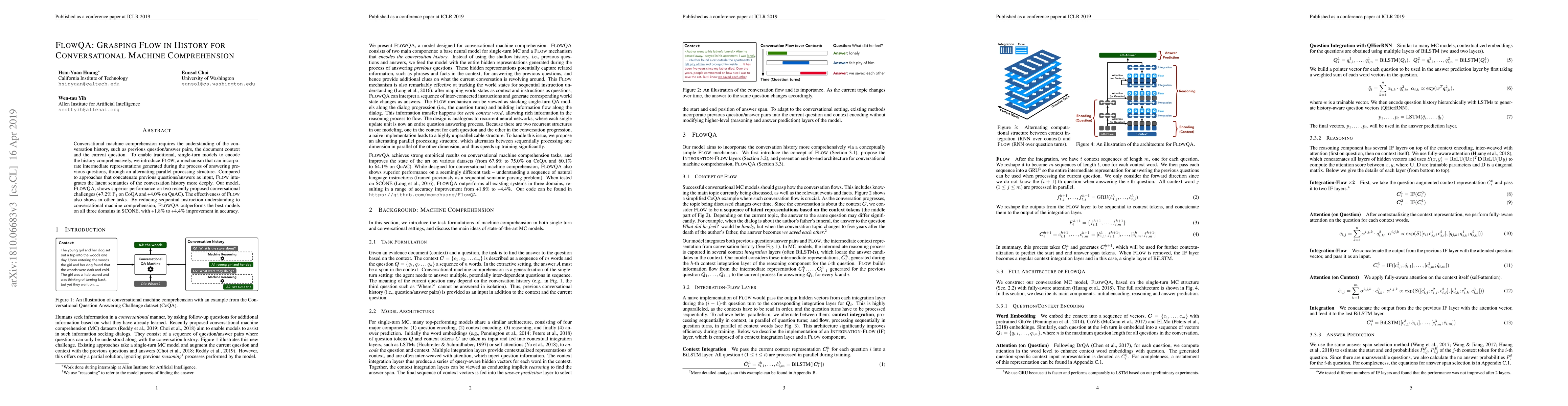 FlowQA introduces Flow, a mechanism that incorporates intermediate representations from previous questions to enhance conversational machine comprehension. This approach outperforms traditional concatenation methods by integrating latent semantics of conversation history more deeply, achieving significant improvements in various conversational challenges and domains.