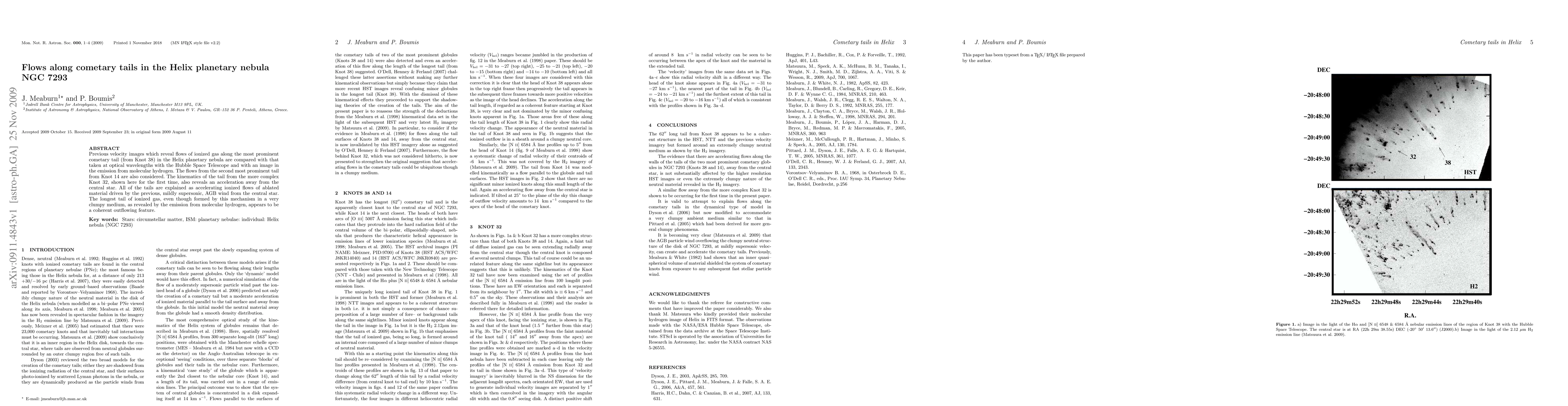 Previous velocity images which reveal flows of ionized gas along the most prominent cometary tail (from Knot 38) in the Helix planetary nebula are compared with that taken at optical wavelengths with the Hubble Space Telescope and with an image in the emission from molecular hydrogen. The flows from the second most prominent tail from Knot 14 are also considered. The kinematics of the tail from the more complex Knot 32, shown here for the first time, also reveals an acceleration away from the central star. All of the tails are explained as accelerating ionized flows of ablated material driven by the previous, mildly supersonic, AGB wind from the central star. The longest tail of ionized gas, even though formed by this mechanism in a very clumpy medium, as revealed by the emission from molecular hydrogen, appears to be a coherent outflowing feature.