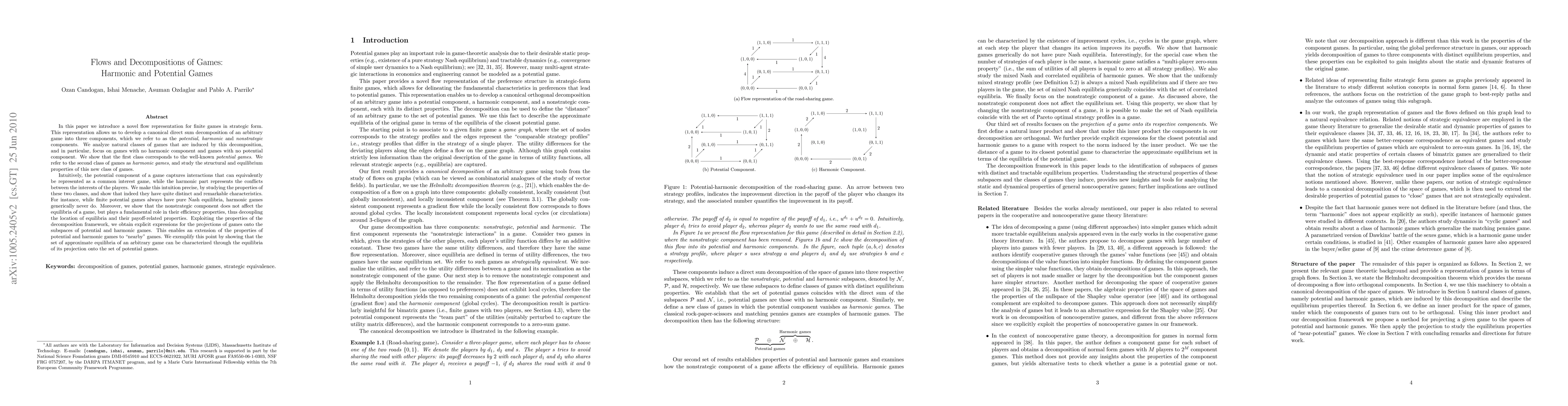The paper introduces a novel flow representation for finite games in strategic form, leading to a canonical direct sum decomposition into potential, harmonic, and nonstrategic components.