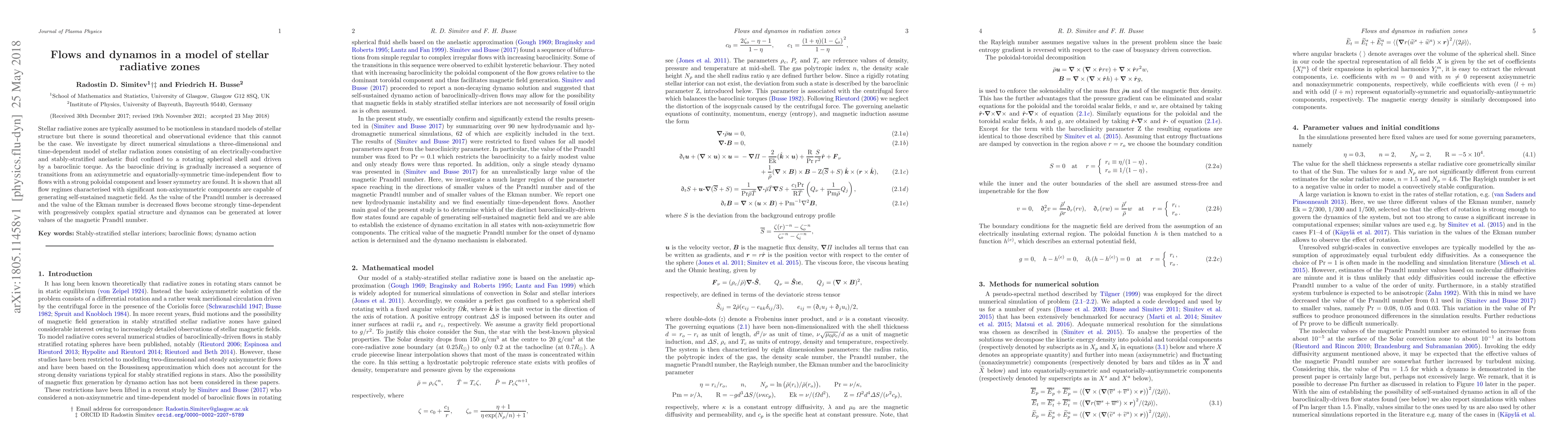 The paper presents detailed numerical simulations of baroclinically-driven flows in stably-stratified rotating spherical shells, revealing new insights into the generation of self-sustained magnetic fields in such systems.
