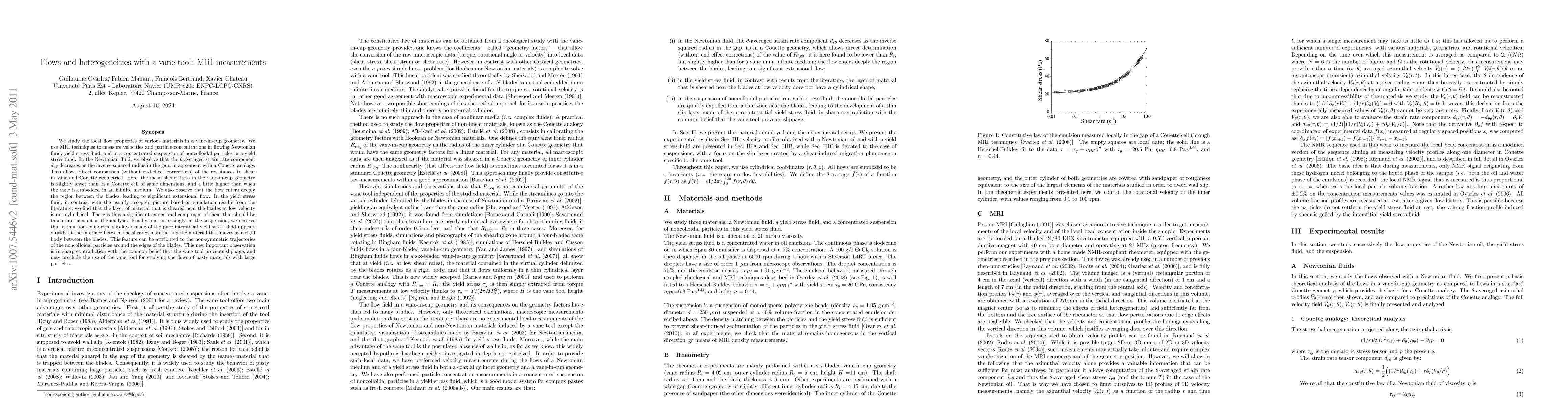 This study uses magnetic resonance imaging to analyze flow properties in various materials within a vane-in-cup geometry, revealing significant heterogeneities. It finds that a thin slip layer forms in suspensions, challenging the assumption that vanes prevent slippage, and suggesting a need for re-evaluation of vane tool applications for studying pasty materials.