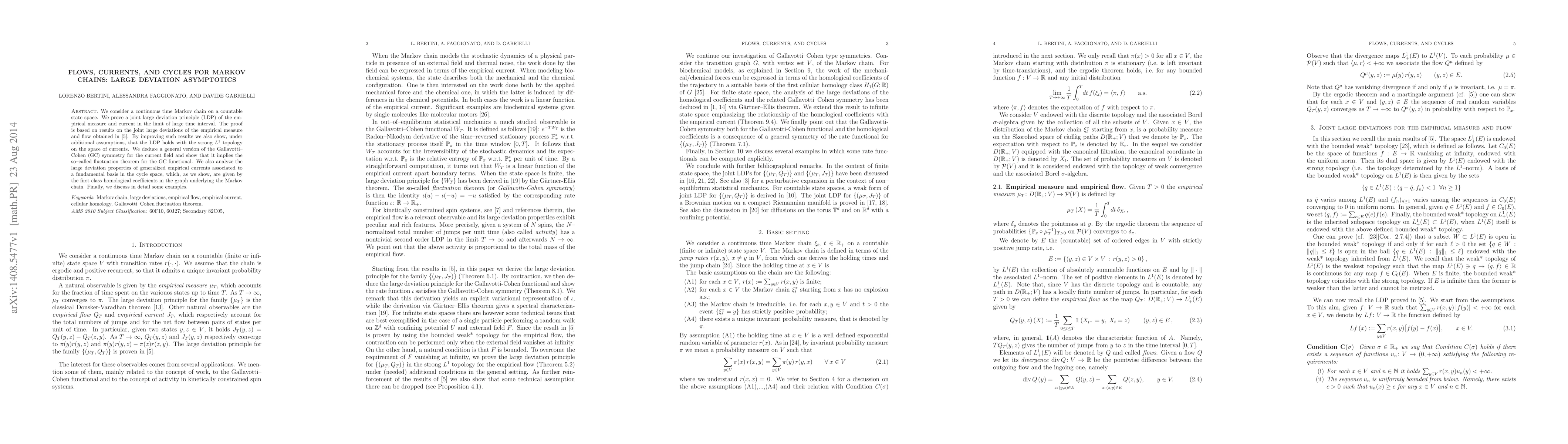 This paper establishes a joint large deviation principle for the empirical measure and current in a continuous time Markov chain, improving existing results and proving the principle under strong L^1 topology. It also deduces a Gallavotti-Cohen symmetry and fluctuation theorem for the current field, and analyzes the large deviation properties of generalized empirical currents linked to homological coefficients in the underlying graph.