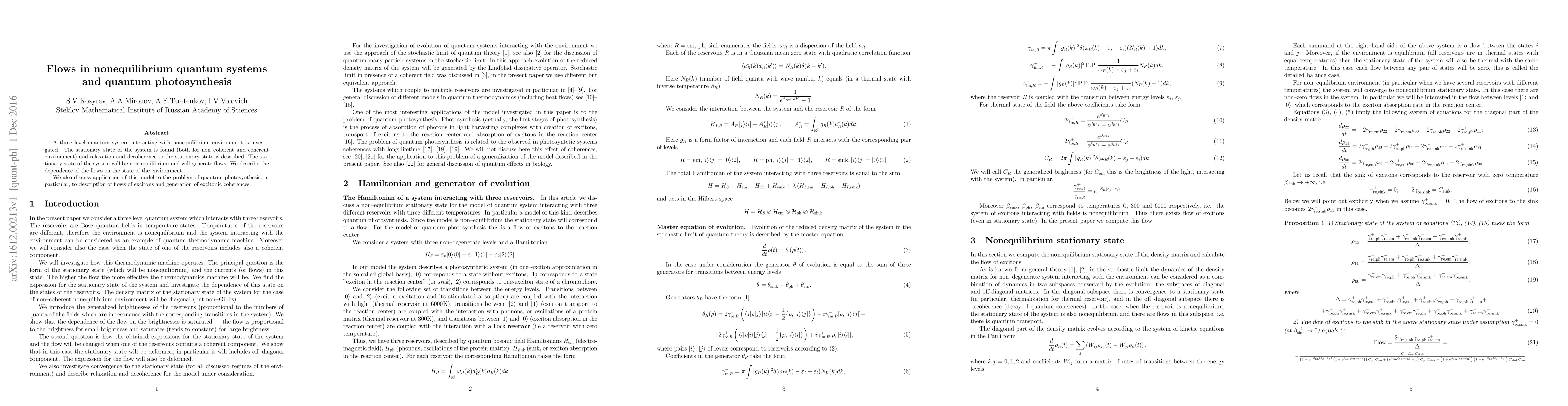 This research investigates a three-level quantum system under nonequilibrium conditions, deriving its stationary state for both non-coherent and coherent environments. It describes relaxation, decoherence, and resultant flows dependent on the environment's state. The model is applied to quantum photosynthesis, elucidating exciton flows and coherence generation.