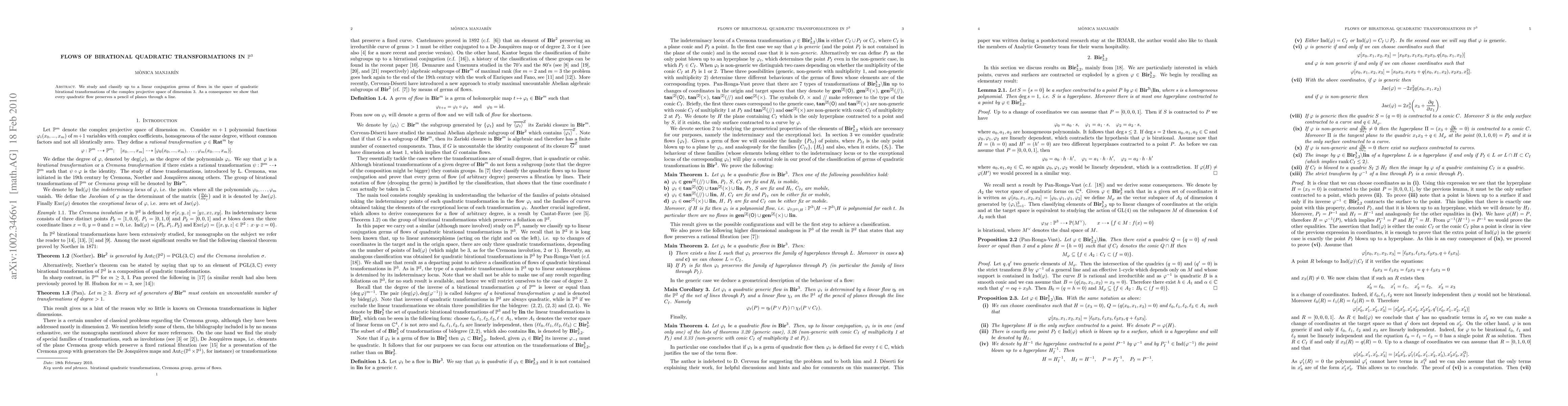 This paper classifies germs of flows in the space of quadratic birational transformations in complex projective 3-space, demonstrating that every such flow preserves a pencil of planes through a line.