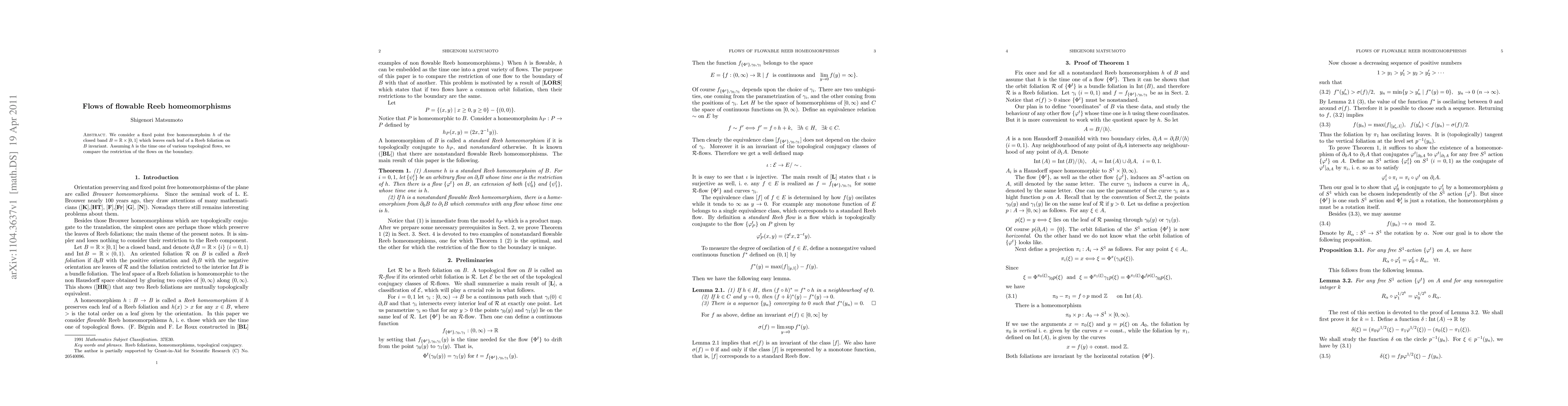 We consider a fixed point free homeomorphsim $h$ of the closed band $B=\R\times[0,1]$ which leaves each leaf of a Reeb foliation on $B$ invariant. Assuming $h$ is the time one of various topological flows, we compare the restriction of the flows on the boundary.