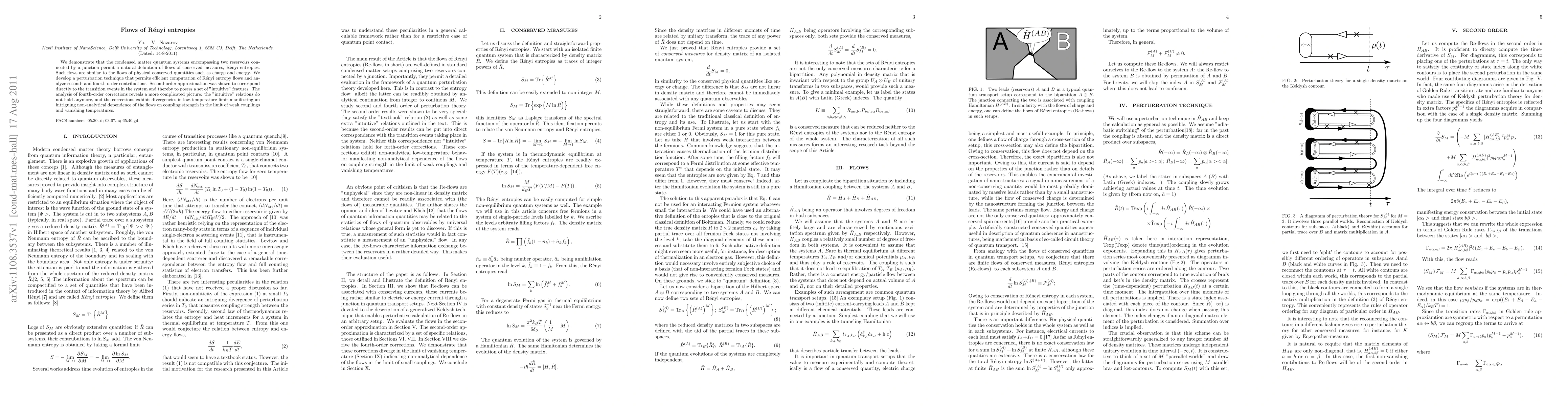 We demonstrate that the condensed matter quantum systems encompassing two reservoirs connected by a junction permit a natural definition of flows of conserved measures, Renyi entropies. Such flows are similar to the flows of physical conserved quantities such as charge and energy. We develop a perturbation technique that permits efficient computation of Renyi entropy flows and analyze second- and fourth order contributions. Second-order approximation was shown to correspond directly to the transition events in the system and thereby to posess a set of "intuitive" features. The analysis of fourth-order corrections reveals a more complicated picture: the "intuitive" relations do not hold anymore, and the corrections exhibit divergencies in low-temperature limit manifesting an intriguing non-analytical dependence of the flows on coupling strength in the limit of weak couplings and vanishing temperatures.