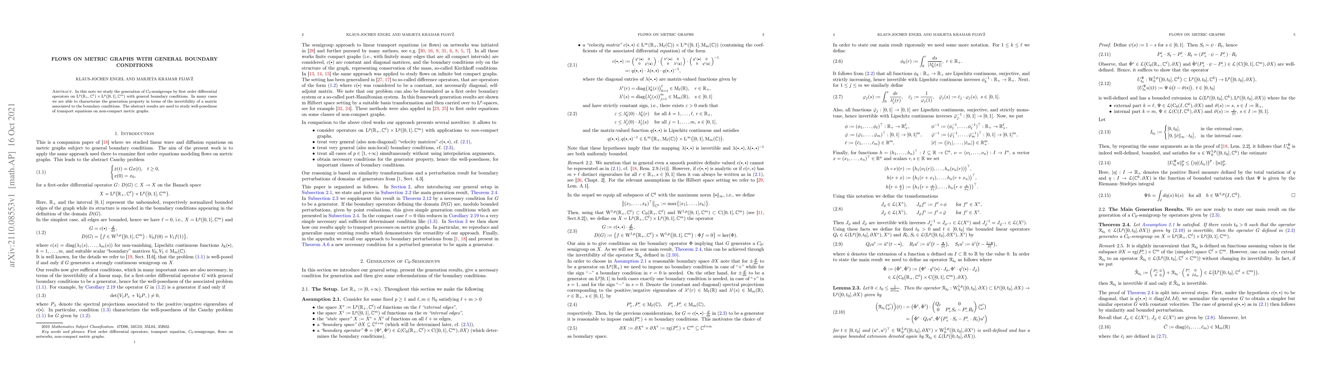In this note we study the generation of $C_0$-semigroups by first order differential operators on $\mathrm{L}^p (\mathbb{R}_+,\mathbb{C}^{\ell})\times \mathrm{L}^p ([0,1],\mathbb{C}^{m})$ with general boundary conditions. In many cases we are able to characterize the generation property in terms of the invertibility of a matrix associated to the boundary conditions. The abstract results are used to study well-posedness of transport equations on non-compact metric graphs.
