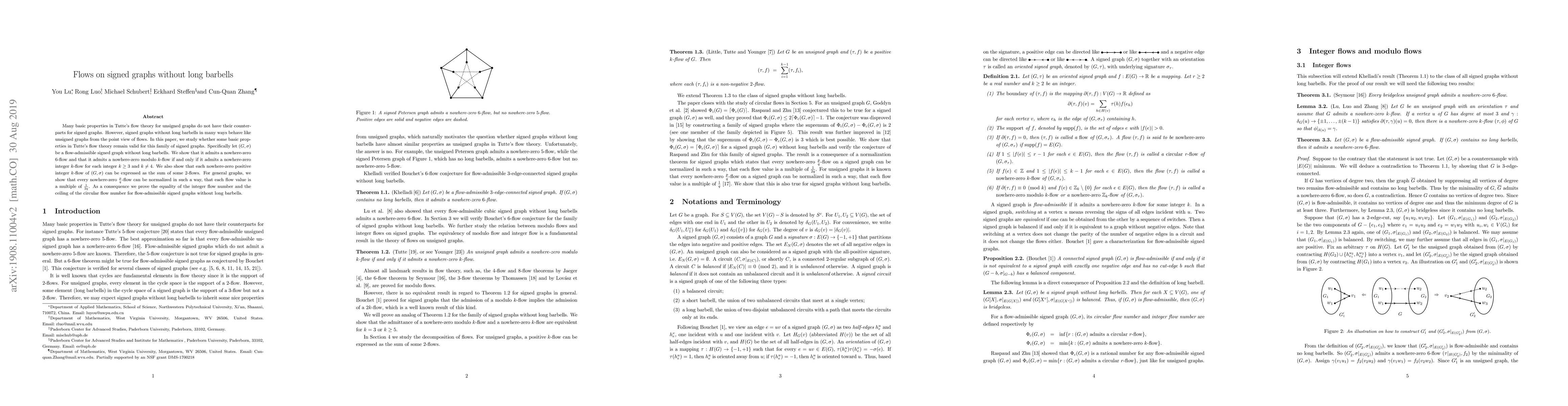 The paper studies flow properties on signed graphs without long barbells, extending Tutte's flow theory for unsigned graphs.