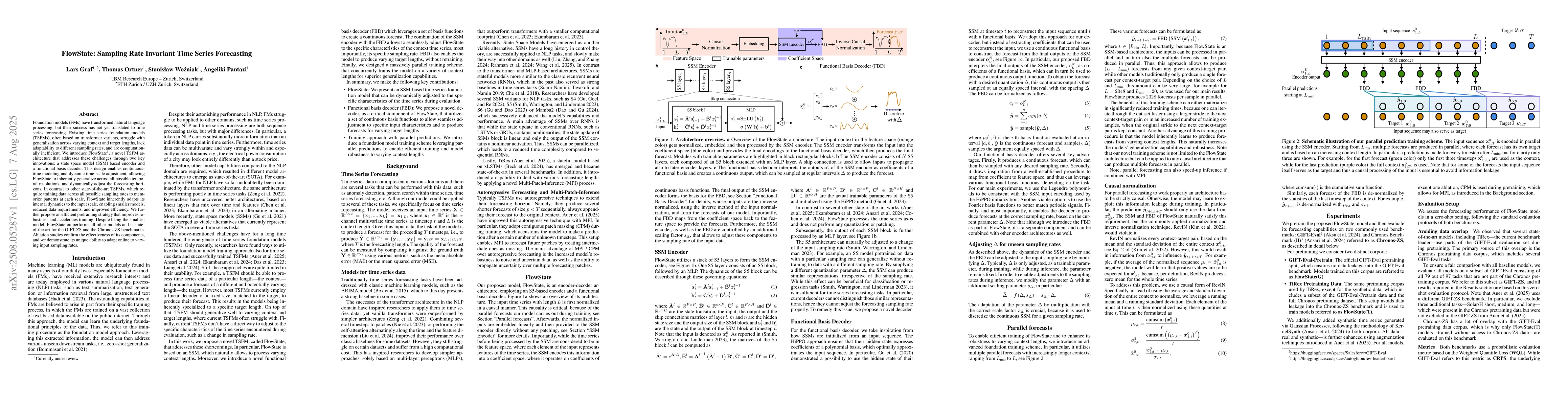 Foundation models (FMs) have transformed natural language processing, but their success has not yet translated to time series forecasting. Existing time series foundation models (TSFMs), often based on transformer variants, struggle with generalization across varying context and target lengths, lack adaptability to different sampling rates, and are computationally inefficient. We introduce FlowState, a novel TSFM architecture that addresses these challenges through two key innovations: a state space model (SSM) based encoder and a functional basis decoder. This design enables continuous-time modeling and dynamic time-scale adjustment, allowing FlowState to inherently generalize across all possible temporal resolutions, and dynamically adjust the forecasting horizons. In contrast to other state-of-the-art TSFMs, which require training data across all possible sampling rates to memorize patterns at each scale, FlowState inherently adapts its internal dynamics to the input scale, enabling smaller models, reduced data requirements, and improved efficiency. We further propose an efficient pretraining strategy that improves robustness and accelerates training. Despite being the smallest model, FlowState outperforms all other models and is state-of-the-art for the GIFT-ZS and the Chronos-ZS benchmarks. Ablation studies confirm the effectiveness of its components, and we demonstrate its unique ability to adapt online to varying input sampling rates.