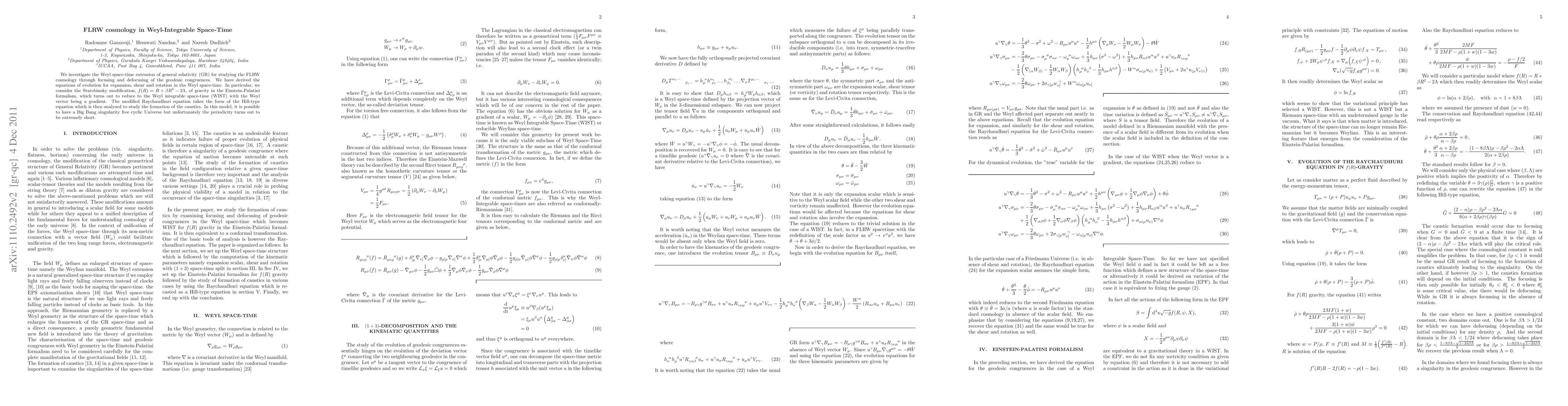 We investigate the Weyl space-time extension of general relativity (GR) for studying the FLRW cosmology through focusing and defocusing of the geodesic congruences. We have derived the equations of evolution for expansion, shear and rotation in the Weyl space-time. In particular we consider the Starobinsky modification, $f(R)=R+\beta R^2-2\Lambda$, of gravity in the Einstein-Palatini formalism, which turns out to reduce to the Weyl integrable space-time (WIST) with the Weyl vector being a gradient. The modified Raychaudhuri equation takes the form of the Hill-type equation which is then analysed for studying formation of the caustics. In this model, it is possible to have a Big Bang singularity free cyclic Universe but unfortunately the periodicity turns out to be extremely short.