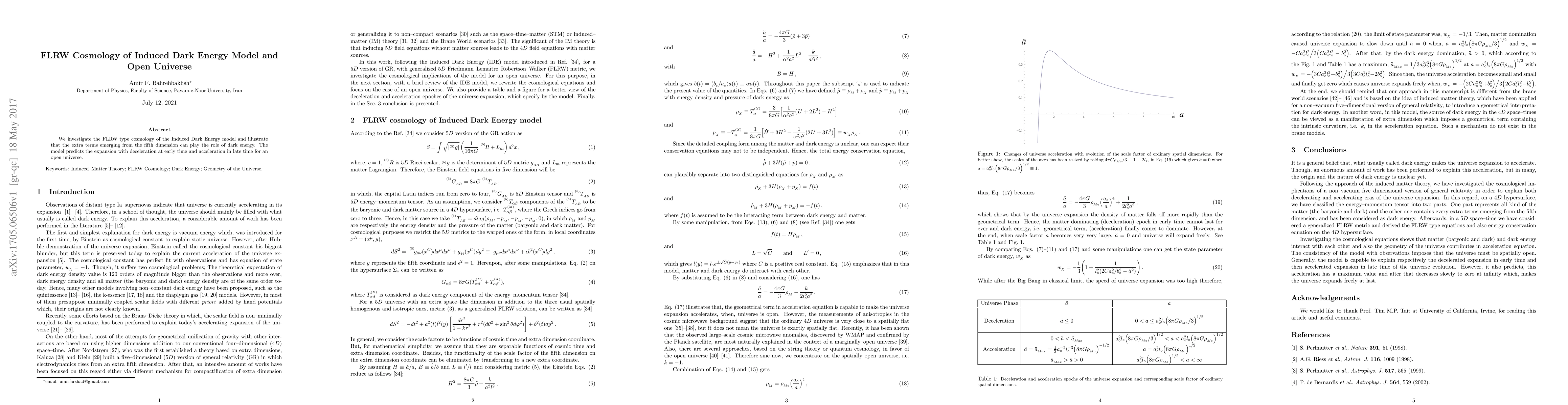 This paper explores the FLRW cosmology within the Induced Dark Energy model, demonstrating that extra terms from the fifth dimension can act as dark energy. The model forecasts early deceleration followed by late-time acceleration in an open universe.