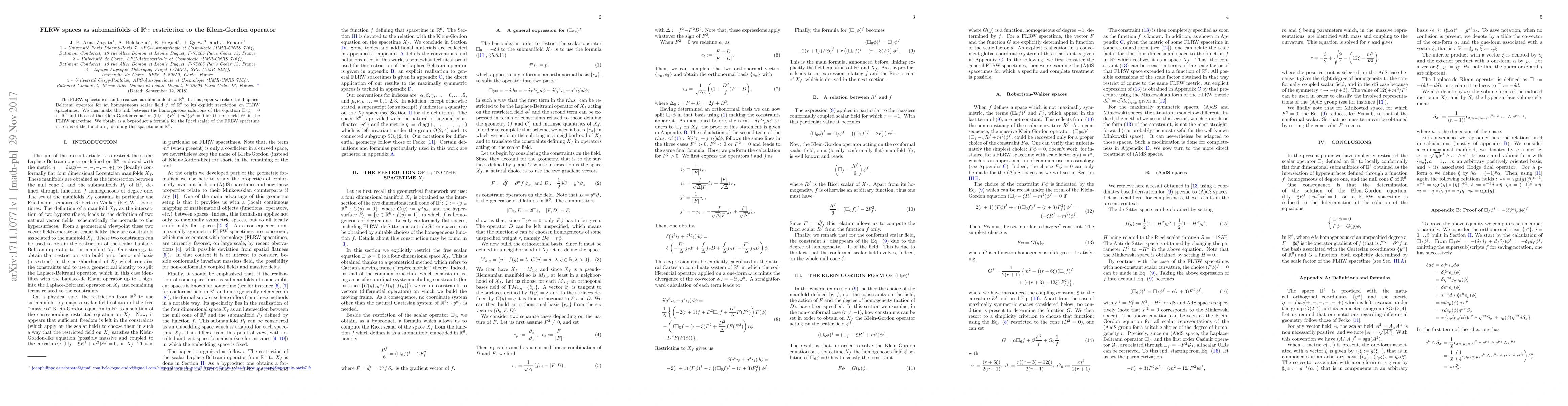 The FLRW spacetimes can be realized as submanifolds of $\mathbb{R}^6$. In this paper we relate the Laplace-Beltrami operator for an homogeneous scalar field $\phi$ of $\mathbb{R}^6$ to its explicit restriction on FLRW spacetimes. We then make the link between the homogeneous solutions of the equation $\square_6 \phi = 0$ in $\mathbb{R}^6$ and those of the Klein-Gordon equation $(\square_{f} - \xi R^f + m^2)\phi^f=0 $ for the free field $\phi^f$ in the FLRW spacetime. We obtain as a byproduct a formula for the Ricci scalar of the FRLW spacetime in terms of the function $f$ defining this spacetime in $\mathbb{R}^6$.