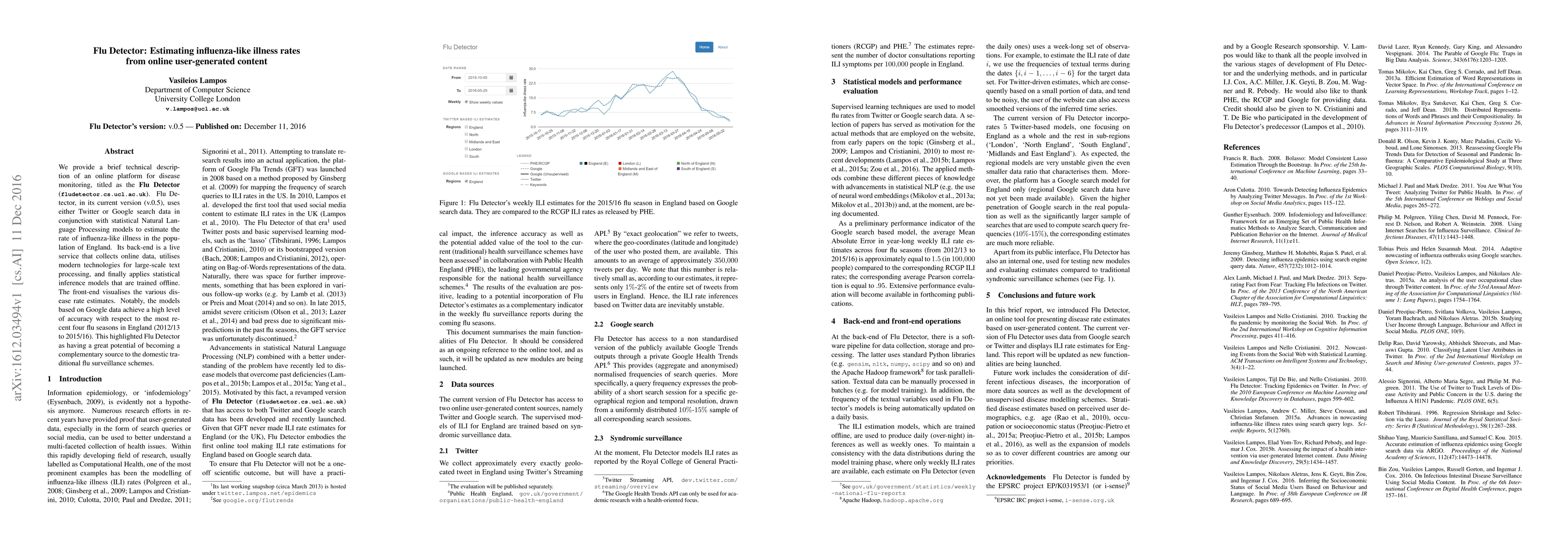 The Flu Detector platform estimates influenza-like illness rates using Twitter or Google search data and NLP models, achieving high accuracy for recent flu seasons in England. It serves as a potential complementary tool to traditional flu surveillance methods.