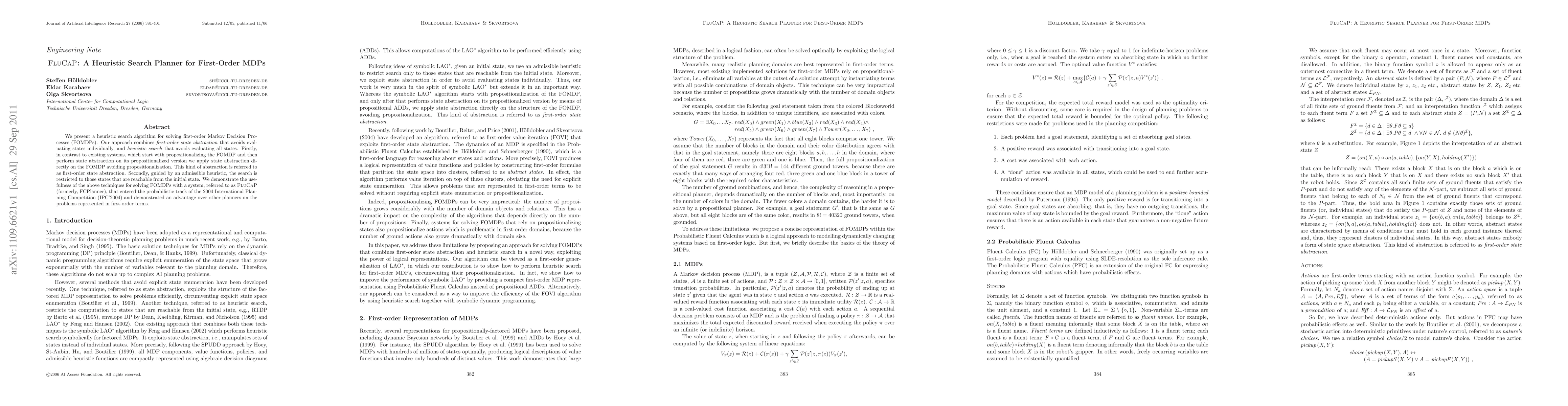 We present a heuristic search algorithm for solving first-order Markov Decision Processes (FOMDPs). Our approach combines first-order state abstraction that avoids evaluating states individually, and heuristic search that avoids evaluating all states. Firstly, in contrast to existing systems, which start with propositionalizing the FOMDP and then perform state abstraction on its propositionalized version we apply state abstraction directly on the FOMDP avoiding propositionalization. This kind of abstraction is referred to as first-order state abstraction. Secondly, guided by an admissible heuristic, the search is restricted to those states that are reachable from the initial state. We demonstrate the usefulness of the above techniques for solving FOMDPs with a system, referred to as FluCaP (formerly, FCPlanner), that entered the probabilistic track of the 2004 International Planning Competition (IPC2004) and demonstrated an advantage over other planners on the problems represented in first-order terms.