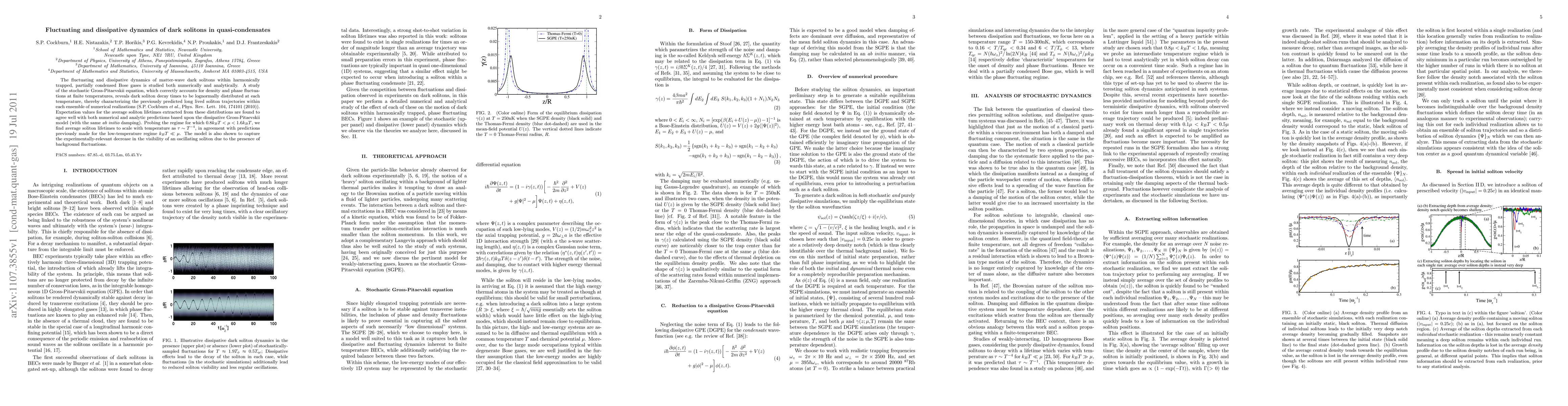 The fluctuating and dissipative dynamics of matter-wave dark solitons within harmonically trapped, partially condensed Bose gases is studied both numerically and analytically. A study of the stochastic Gross-Pitaevskii equation, which correctly accounts for density and phase fluctuations at finite temperatures, reveals dark soliton decay times to be lognormally distributed at each temperature, thereby characterizing the previously predicted long lived soliton trajectories within each ensemble of numerical realizations (S.P. Cockburn {\it et al.}, Phys. Rev. Lett. 104, 174101 (2010)). Expectation values for the average soliton lifetimes extracted from these distributions are found to agree well with both numerical and analytic predictions based upon the dissipative Gross-Pitaevskii model (with the same {\it ab initio} damping). Probing the regime for which $0.8 k_{B}T < \mu < 1.6 k_{B}T$, we find average soliton lifetimes to scale with temperature as $\tau\sim T^{-4}$, in agreement with predictions previously made for the low-temperature regime $k_{B}T\ll\mu$. The model is also shown to capture the experimentally-relevant decrease in the visibility of an oscillating soliton due to the presence of background fluctuations.