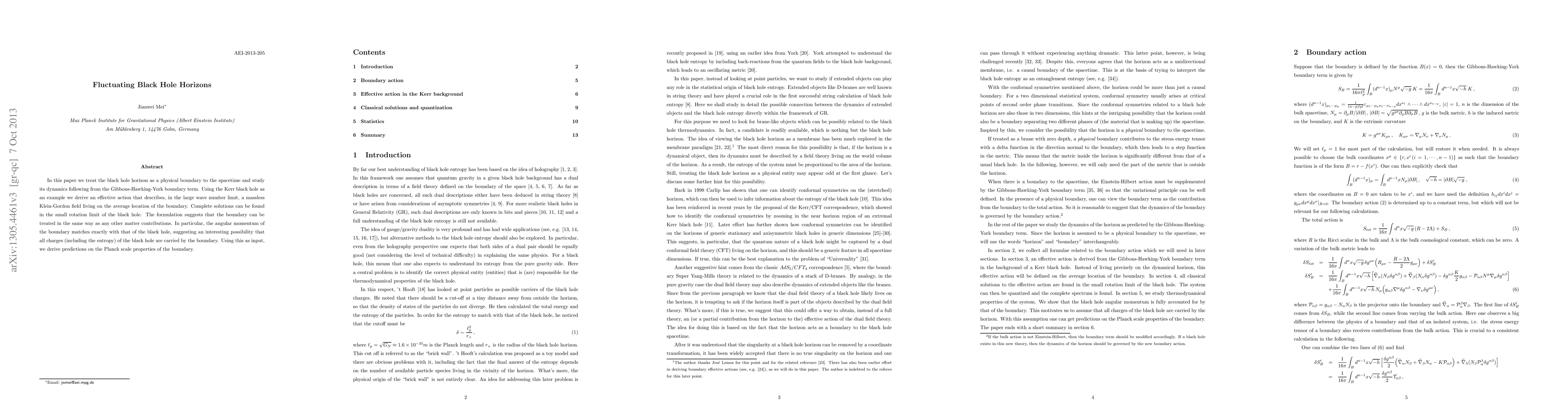 In this paper we treat the black hole horizon as a physical boundary to the spacetime and study its dynamics following from the Gibbons-Hawking-York boundary term. Using the Kerr black hole as an example we derive an effective action that describes, in the large wave number limit, a massless Klein-Gordon field living on the average location of the boundary. Complete solutions can be found in the small rotation limit of the black hole. The formulation suggests that the boundary can be treated in the same way as any other matter contributions. In particular, the angular momentum of the boundary matches exactly with that of the black hole, suggesting an interesting possibility that all charges (including the entropy) of the black hole are carried by the boundary. Using this as input, we derive predictions on the Planck scale properties of the boundary.