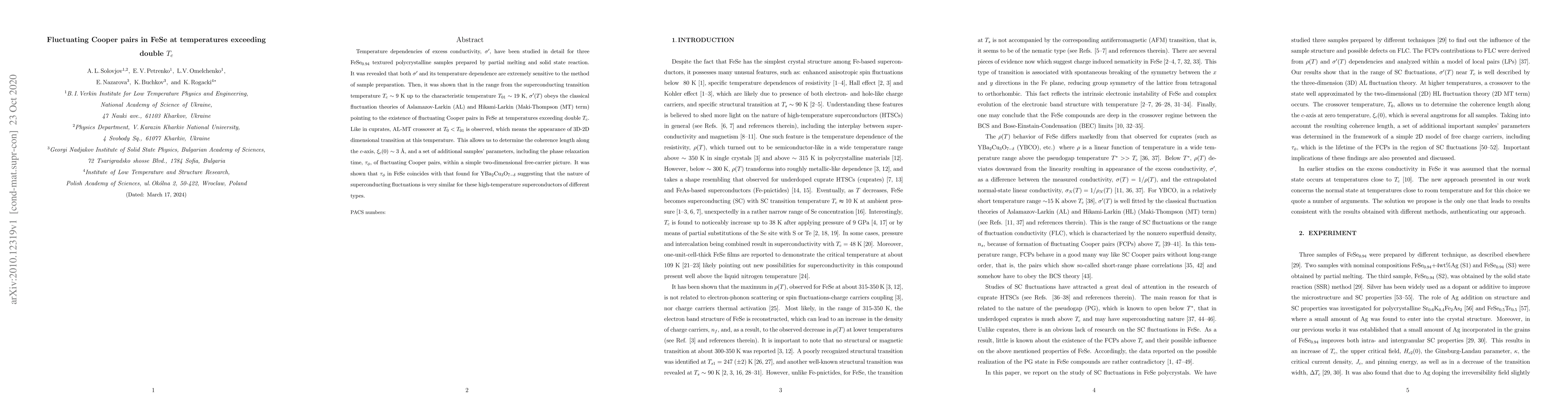 Temperature dependencies of excess conductivity, Sigma', have been studied in detail for three FeSe_{0.94} textured polycrystalline samples prepared by partial melting and solid state reaction. It was revealed that both Sigma' and its temperature dependence are extremely sensitive to the method of sample preparation. Then, it was shown that in the range from the superconducting transition temperature Tc ~ 9 K up to the characteristic temperature T_01 ~ 19 K, Sigma'(T) obeys the classical fluctuation theories of Aslamazov-Larkin (AL) and Hikami-Larkin (Maki-Thompson (MT) term) pointing to the existence of fluctuating Cooper pairs in FeSe at temperatures exceeding double Tc. Like in cuprates, AL-MT crossover at T_0 < T_{01} is observed, which means the appearance of 3D-2D dimensional transition at this temperature. This allows us to determine the coherence length along the c-axis, Xi_c(0) ~ 3 A, and a set of additional samples' parameters, including the phase relaxation time, Tau_{Phi}, of fluctuating Cooper pairs, within a simple two-dimensional free-carrier picture. It was shown that Tau_{Phi} in FeSe coincides with that found for YBa2Cu3O7 suggesting that the nature of superconducting fluctuations is very similar for these high-temperature superconductors of different types.