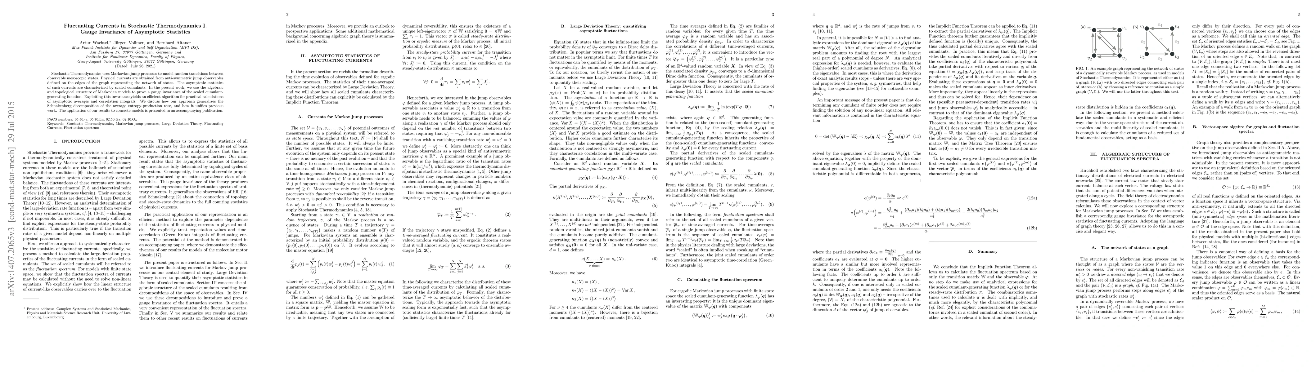 Stochastic Thermodynamics uses Markovian jump processes to model random transitions between observable mesoscopic states. Physical currents are obtained from anti-symmetric jump observables defined on the edges of the graph representing the network of states. The asymptotic statistics of such currents are characterized by scaled cumulants. In the present work, we use the algebraic and topological structure of Markovian models to prove a gauge invariance of the scaled cumulant-generating function. Exploiting this invariance yields an efficient algorithm for practical calculations of asymptotic averages and correlation integrals. We discuss how our approach generalizes the Schnakenberg decomposition of the average entropy-production rate, and how it unifies previous work. The application of our results to concrete models is presented in an accompanying publication.