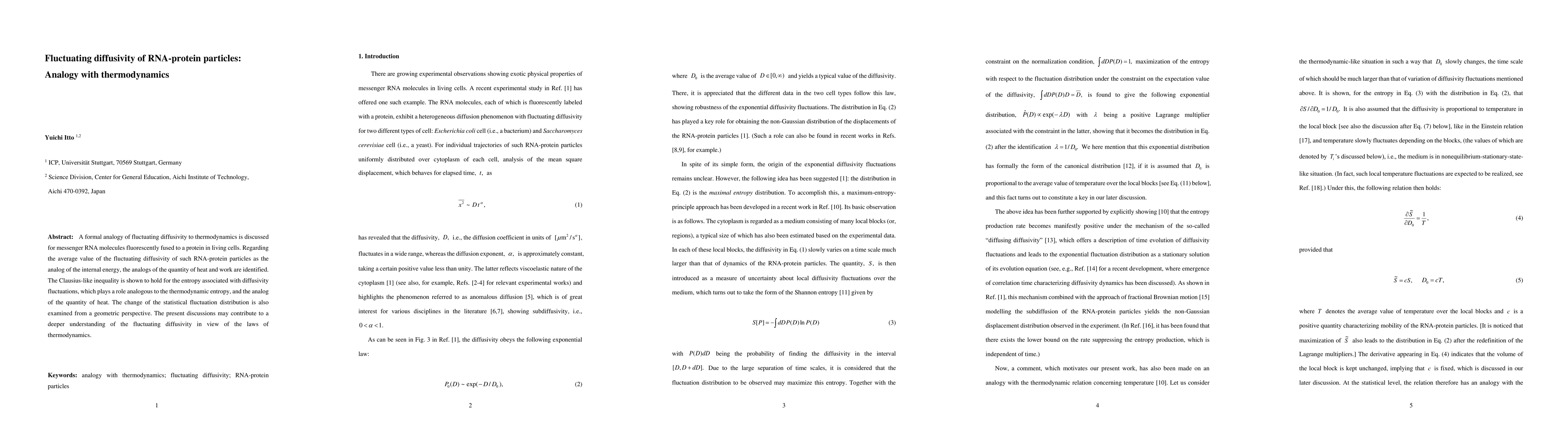 This paper explores the analogy between the fluctuating diffusivity of RNA-protein particles in living cells and thermodynamic principles, identifying internal energy, heat, and work analogs. It demonstrates the applicability of a Clausius-like inequality to the entropy associated with these fluctuations, offering insights into the statistical behavior of diffusivity.
