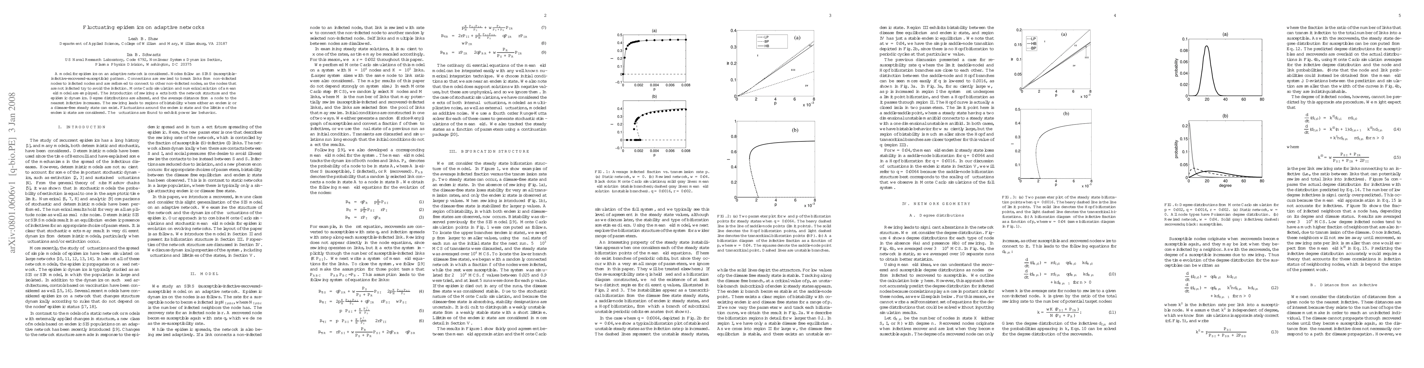 This paper models epidemics on adaptive networks where nodes follow a SIRS pattern and connections are rewired to avoid infected nodes. The rewiring alters network structure and dynamics, leading to regions of bistability and power-law fluctuations around the endemic state.