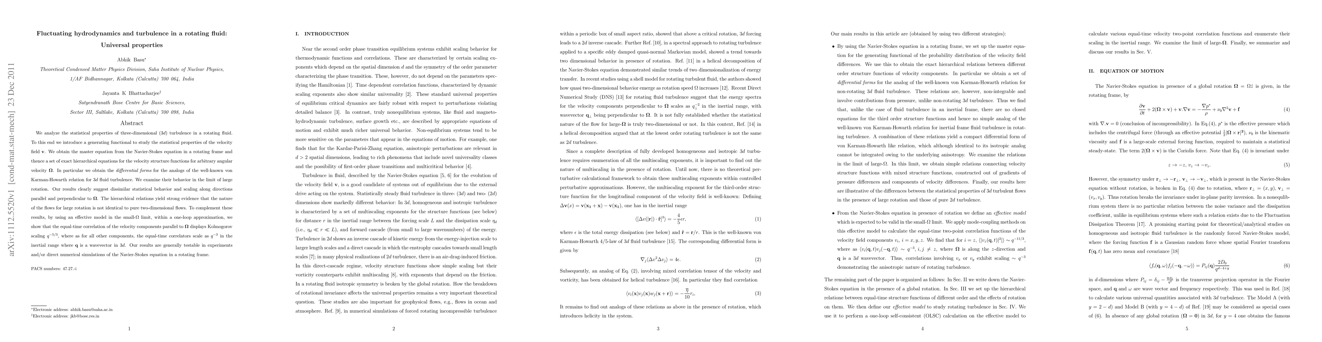 We analyze the statistical properties of three-dimensional ($3d$) turbulence in a rotating fluid. To this end we introduce a generating functional to study the statistical properties of the velocity field $\bf v$. We obtain the master equation from the Navier-Stokes equation in a rotating frame and thence a set of exact hierarchical equations for the velocity structure functions for arbitrary angular velocity $\mathbf \Omega$. In particular we obtain the {\em differential forms} for the analogs of the well-known von Karman-Howarth relation for $3d$ fluid turbulence. We examine their behavior in the limit of large rotation. Our results clearly suggest dissimilar statistical behavior and scaling along directions parallel and perpendicular to $\mathbf \Omega$. The hierarchical relations yield strong evidence that the nature of the flows for large rotation is not identical to pure two-dimensional flows. To complement these results, by using an effective model in the small-$\Omega$ limit, within a one-loop approximation, we show that the equal-time correlation of the velocity components parallel to $\mathbf \Omega$ displays Kolmogorov scaling $q^{-5/3}$, where as for all other components, the equal-time correlators scale as $q^{-3}$ in the inertial range where $\bf q$ is a wavevector in $3d$. Our results are generally testable in experiments and/or direct numerical simulations of the Navier-Stokes equation in a rotating frame.