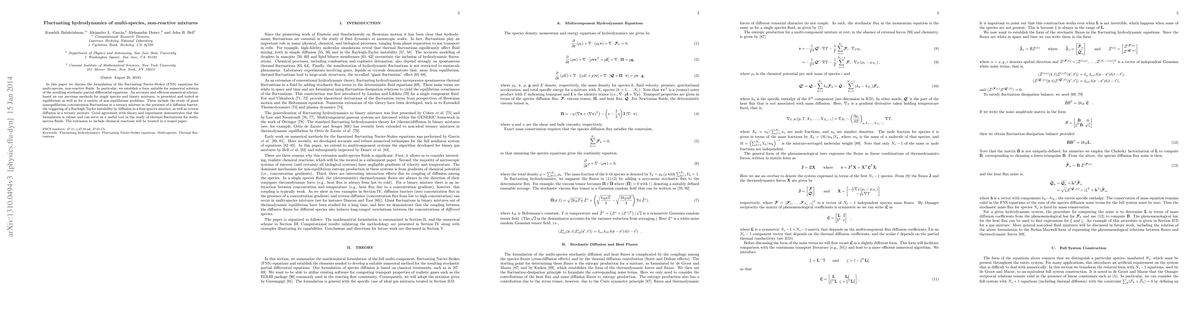 In this paper we discuss the formulation of the fuctuating Navier-Stokes (FNS) equations for multi-species, non-reactive fluids. In particular, we establish a form suitable for numerical solution of the resulting stochastic partial differential equations. An accurate and efficient numerical scheme, based on our previous methods for single species and binary mixtures, is presented and tested at equilibrium as well as for a variety of non-equilibrium problems. These include the study of giant nonequilibrium concentration fluctuations in a ternary mixture in the presence of a diffusion barrier, the triggering of a Rayleigh-Taylor instability by diffusion in a four-species mixture, as well as reverse diffusion in a ternary mixture. Good agreement with theory and experiment demonstrates that the formulation is robust and can serve as a useful tool in the study of thermal fluctuations for multi-species fluids. The extension to include chemical reactions will be treated in a sequel paper.