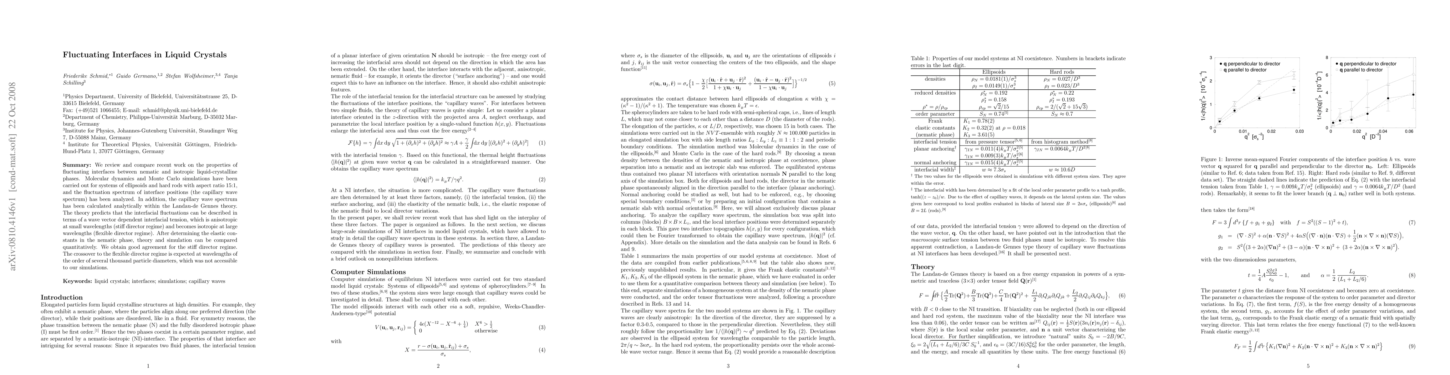 This paper reviews recent studies on fluctuating interfaces between nematic and isotropic liquid-crystalline phases, comparing molecular dynamics and Monte Carlo simulations with analytical predictions from the Landau-de Gennes theory. The study finds good agreement between theory and simulations for the stiff director regime, while the flexible director regime remains beyond current simulation limits.