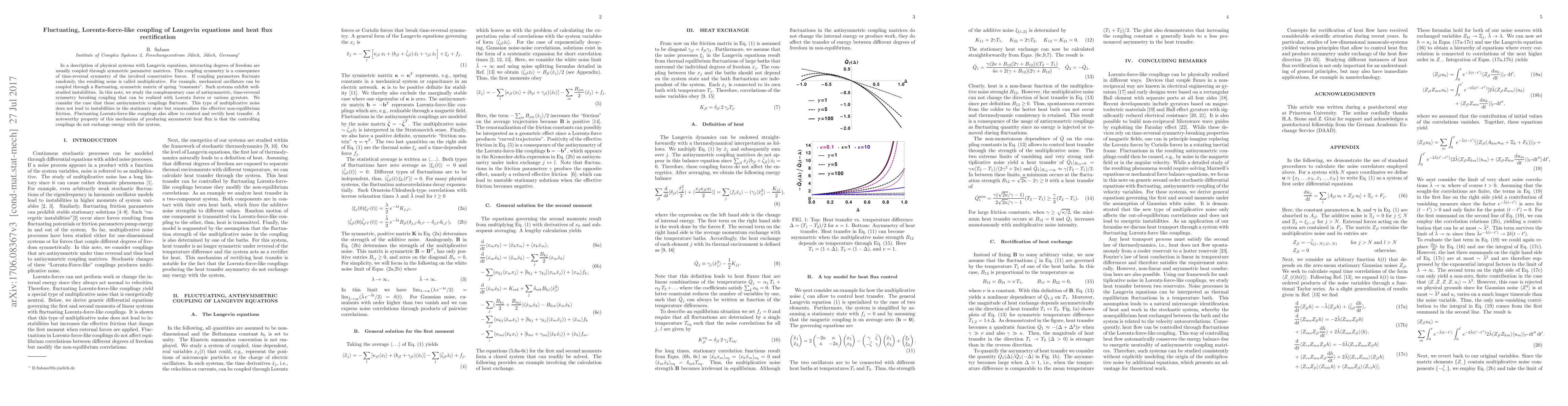 In a description of physical systems with Langevin equations, interacting degrees of freedom are usually coupled through symmetric parameter matrices. This coupling symmetry is a consequence of time-reversal symmetry of the involved conservative forces. If coupling parameters fluctuate randomly, the resulting noise is called multiplicative. For example, mechanical oscillators can be coupled through a fluctuating, symmetric matrix of spring "constants". Such systems exhibit well-studied instabilities. In this note, we study the complementary case of antisymmetric, time-reversal symmetry breaking coupling that can be realized with Lorentz forces or various gyrators. We consider the case that these antisymmetric couplings fluctuate. This type of multiplicative noise does not lead to instabilities in the stationary state but renormalizes the effective non-equilibrium friction. Fluctuating Lorentz-force-like couplings also allow to control and rectify heat transfer. A noteworthy property of this mechanism of producing asymmetric heat flux is that the controlling couplings do not exchange energy with the system..