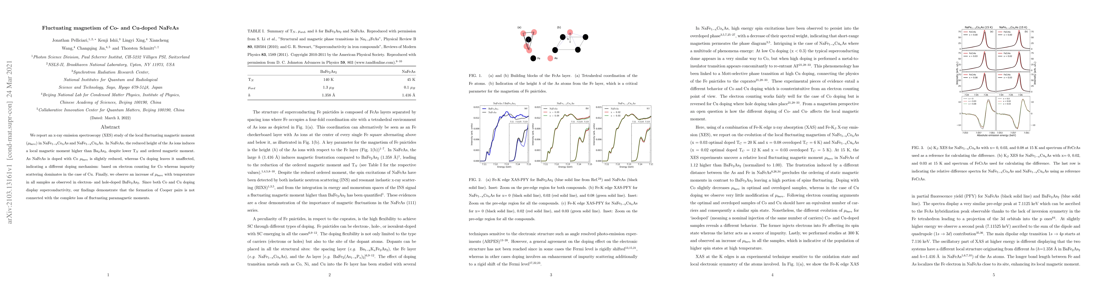 We report an x-ray emission spectroscopy (XES) study of the local fluctuating magnetic moment ($\mu_{bare}$) in $\mathrm{NaFe_{1-x}Co_{x}As}$ and $\mathrm{NaFe_{1-x}Cu_{x}As}$. In NaFeAs, the reduced height of the As ions induces a local magnetic moment higher than $\mathrm{Ba_2As_2}$, despite lower T$_N$ and ordered magnetic moment. As NaFeAs is doped with Co $\mu_{bare}$ is slightly reduced, whereas Cu doping leaves it unaffected, indicating a different doping mechanism: based on electron counting for Co whereas impurity scattering dominates in the case of Cu. Finally, we observe an increase of $\mu_{bare}$ with temperature in all samples as observed in electron- and hole-doped $\mathrm{BaFe_2As_2}$. Since both Co and Cu doping display superconductivity, our findings demonstrate that the formation of Cooper pairs is not connected with the complete loss of fluctuating paramagnetic moments.