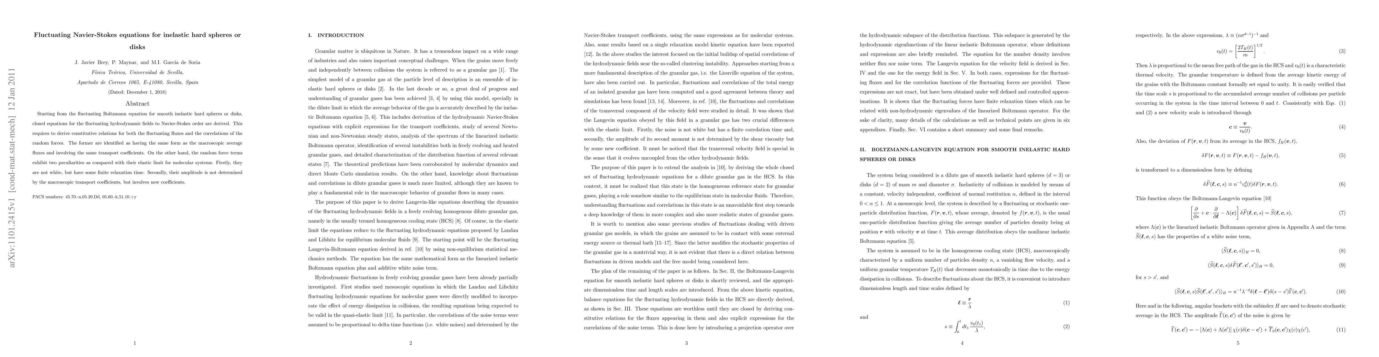 Starting from the fluctuating Boltzmann equation for smooth inelastic hard spheres or disks, closed equations for the fluctuating hydrodynamic fields to Navier-Stokes order are derived. This requires to derive constitutive relations for both the fluctuating fluxes and the correlations of the random forces. The former are identified as having the same form as the macroscopic average fluxes and involving the same transport coefficients. On the other hand, the random force terms exhibit two peculiarities as compared with their elastic limit for molecular systems. Firstly, they are not white, but have some finite relaxation time. Secondly, their amplitude is not determined by the macroscopic transport coefficients, but involves new coefficients.