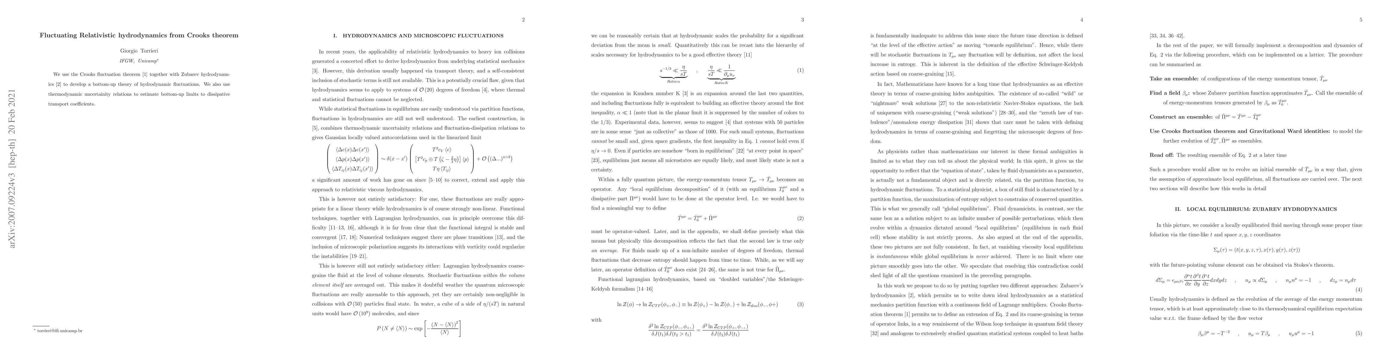This paper uses Crooks theorem to develop a theory of hydrodynamic fluctuations in relativistic hydrodynamics, with implications for understanding dissipative transport coefficients.