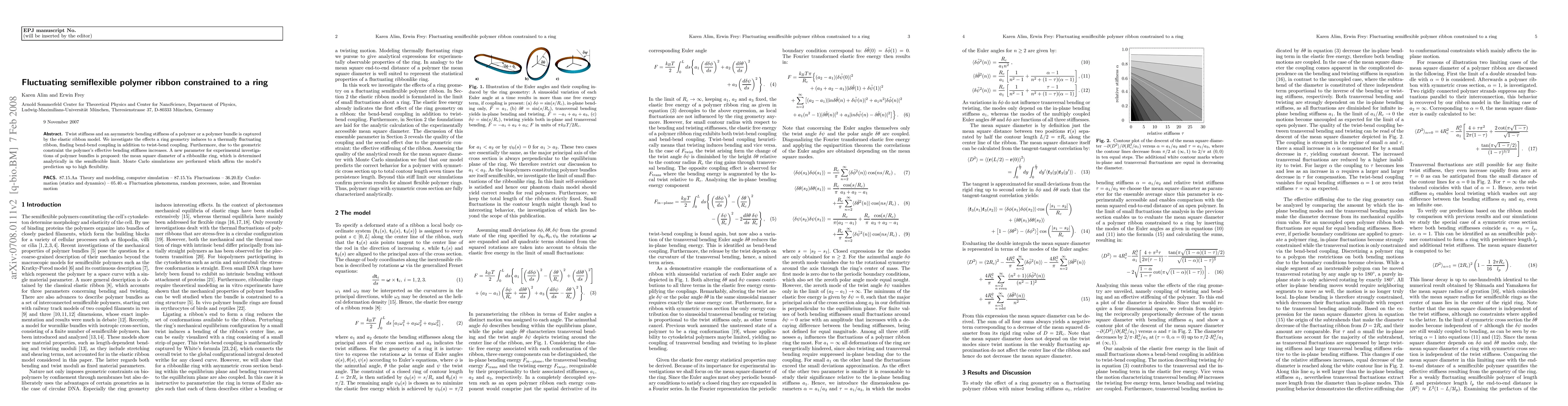 Twist stiffness and an asymmetric bending stiffness of a polymer or a polymer bundle is captured by the elastic ribbon model. We investigate the effects a ring geometry induces to a thermally fluctuating ribbon, finding bend-bend coupling in addition to twist-bend coupling. Furthermore, due to the geometric constraint the polymer's effective bending stiffness increases. A new parameter for experimental investigations of polymer bundles is proposed: the mean square diameter of a ribbonlike ring, which is determined analytically in the semiflexible limit. Monte Carlo simulations are performed which affirm the model's prediction up to high flexibility.