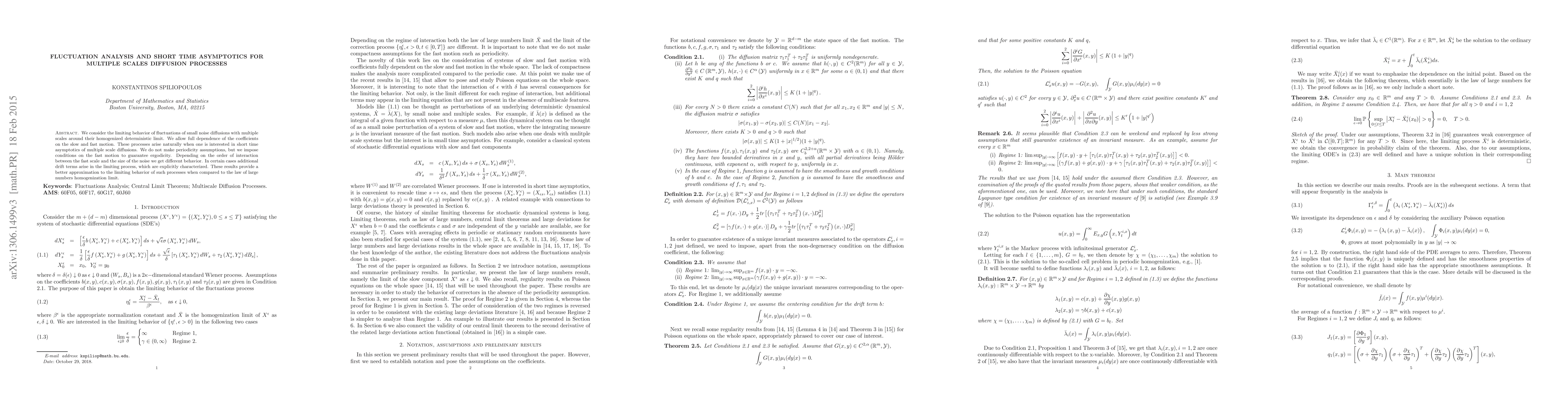 We consider the limiting behavior of fluctuations of small noise diffusions with multiple scales around their homogenized deterministic limit. We allow full dependence of the coefficients on the slow and fast motion. These processes arise naturally when one is interested in short time asymptotics of multiple scale diffusions. We do not make periodicity assumptions, but we impose conditions on the fast motion to guarantee ergodicity. Depending on the order of interaction between the fast scale and the size of the noise we get different behavior. In certain cases additional drift terms arise in the limiting process, which are explicitly characterized. These results provide a better approximation to the limiting behavior of such processes when compared to the law of large numbers homogenization limit.