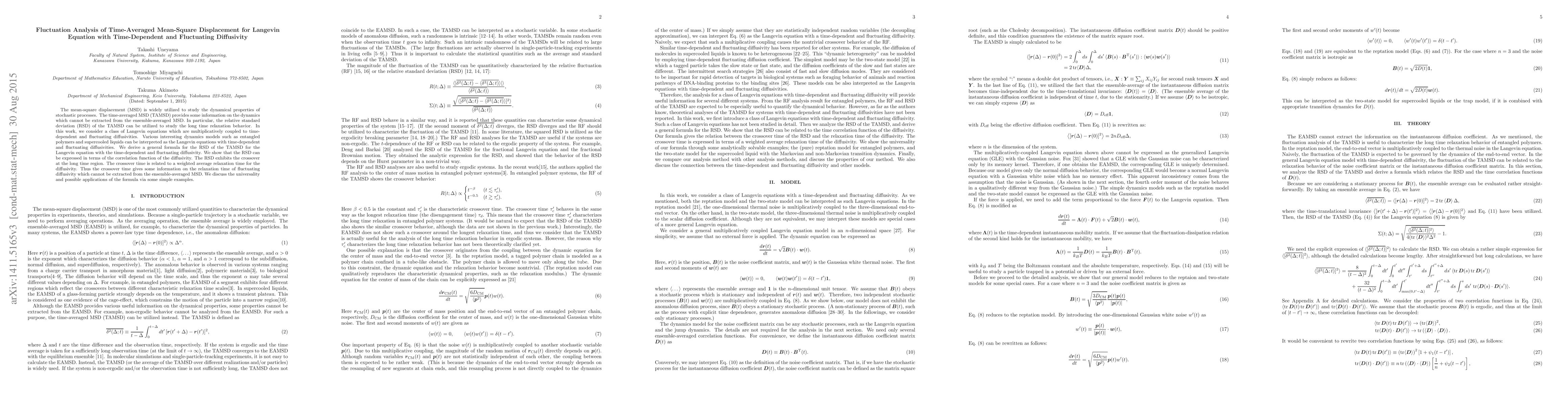 This paper derives a formula for the relative standard deviation of time-averaged mean-square displacement in Langevin equations with time-dependent and fluctuating diffusivities, revealing long-time relaxation behavior and crossover times related to diffusivity relaxation. The findings provide insights into dynamics of complex systems like entangled polymers and supercooled liquids.