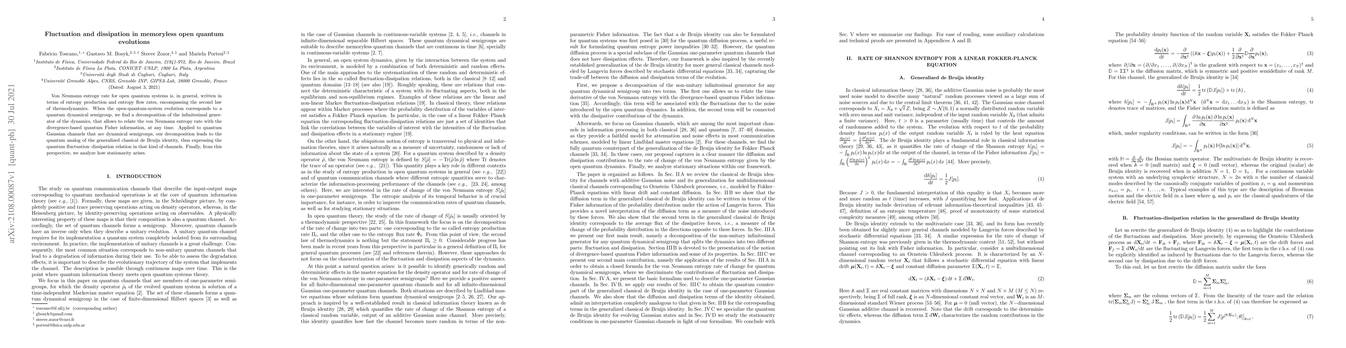 This paper decomposes the infinitesimal generator of quantum dynamical semigroups to relate the von Neumann entropy rate with quantum Fisher information, establishing a quantum fluctuation-dissipation relation for quantum Gaussian channels and analyzing the emergence of stationarity.