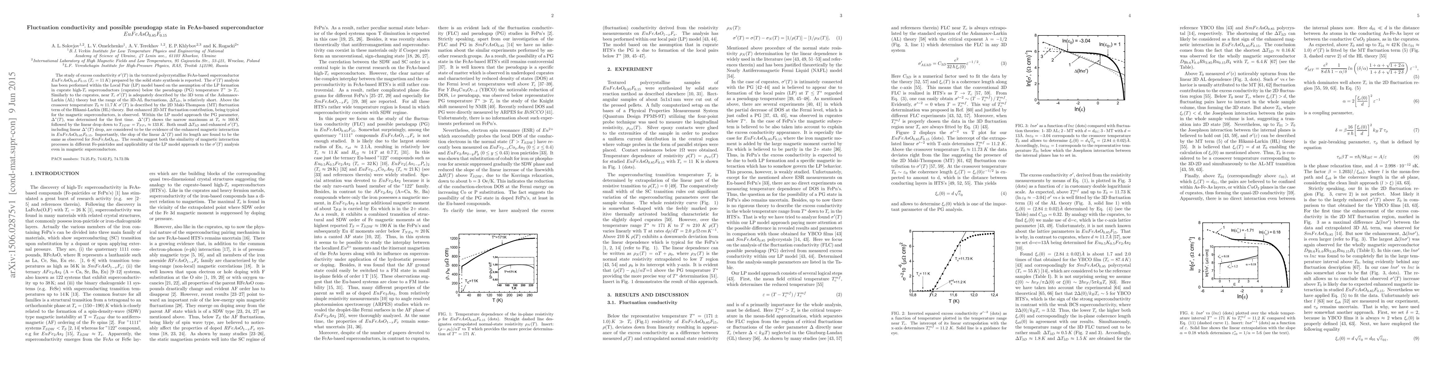 The study of excess conductivity $\sigma'(T)$ in the textured polycrystalline FeAs-based superconductor $EuFeAsO_{0.85}F_{0.15}$ ($T_c = 11\, K$) prepared by the solid state synthesis is reported. The $\sigma'(T)$ analysis has been performed within the Local Pair (LP) model based on the assumption of the LP formation in cuprate high-$T_c$ superconductors (cuprates) below the pseudogap (PG) temperature $T^*\gg T_c$. Similarly to the cuprates, near $T_c$ $\sigma'(T)$ is adequately described by the 3D term of the Aslamasov-Larkin (AL) theory but the range of the 3D-AL fluctuations, $\Delta T_{3D}$, is relatively short. Above the crossover temperature $T_0 \approx 11.7\,K$ $\sigma'(T)$ is described by the 2D Maki-Thompson (MT) fluctuation term of the Hikami-Larkin (HL) theory. But enhanced 2D-MT fluctuation contribution, being typical for the magnetic superconductors, is observed. Within the LP model approach the PG parameter, $\Delta^*(T)$, was determined for the first time. $\Delta^*(T)$ shows the narrow maximum at $T_s \approx 160\,K$ followed by the linear drop down to $T_{SDW}=T_{NFe}\approx 133\,K$. Both small $\Delta T_{3D}$ and enhanced $\sigma'(T)$, including linear $\Delta^*(T)$ drop, are considered to be the evidence of the enhanced magnetic interaction in $EuFeAsO_{0.85}F_{0.15}$. Importantly, the slop of the linear $\Delta^*(T)$ and its length are found to be the same as observed for $SmFeAsO_{0.85}$. The results suggest both the similarity of magnetic interaction processes in different Fe-pnictides and applicability of the LP model approach to the $\sigma'(T)$ analysis even in magnetic superconductors.