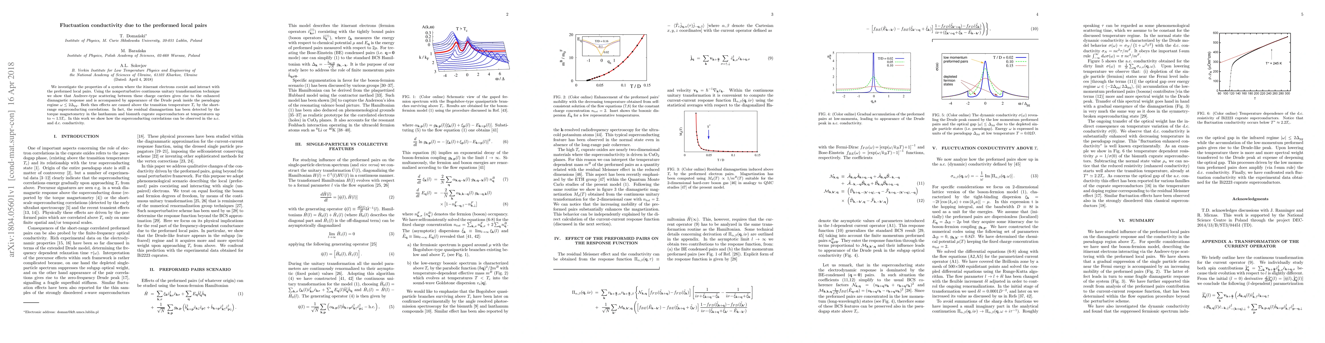 We investigate the properties of a system where the itinerant electrons coexist and interact with the preformed local pairs. Using the nonperturbative continuous unitary transformation technique we show that Andreev-type scattering between these charge carriers gives rise to the enhanced diamagnetic response and is accompanied by appearance of the Drude peak inside the pseudogap regime \omega <2\Delta_{pg}. Both thes effects are caused above the transition temperature T_c by the short-range superconducting correlations. In fact, the residual diamagnetism has been detected by the torque magnetometry in the lanthanum and bismuth cuprate superconductors at temperatures up to ~ 1.5T_c. In this work we show how the superconducting correlations can be observed in the a.c. and d.c. conductivity.