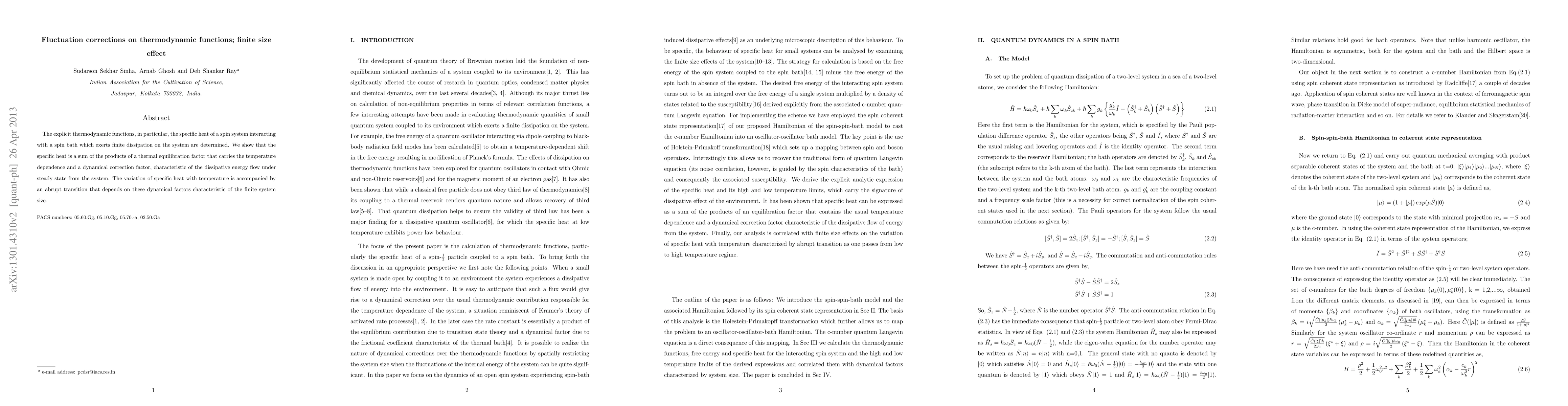 The explicit thermodynamic functions, in particular, the specific heat of a spin system interacting with a spin bath which exerts finite dissipation on the system are determined. We show that the specific heat is a sum of the products of a thermal equilibration factor that carries the temperature dependence and a dynamical correction factor, characteristic of the dissipative energy flow under steady state from the system. The variation of specific heat with temperature is accompanied by an abrupt transition that depends on these dynamical factors characteristic of the finite system size.