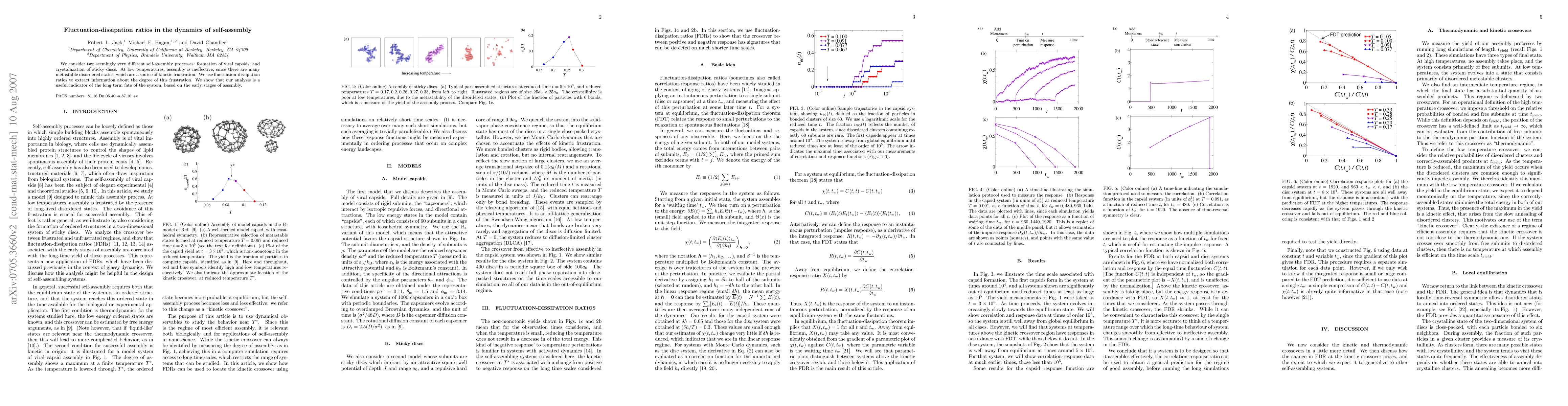 The research employs fluctuation-dissipation ratios (FDRs) to analyze the dynamics of self-assembly in two systems: viral capsids and sticky discs crystallization. It examines the systems at low temperatures where assembly is ineffective due to kinetic frustration from numerous metastable disordered states.