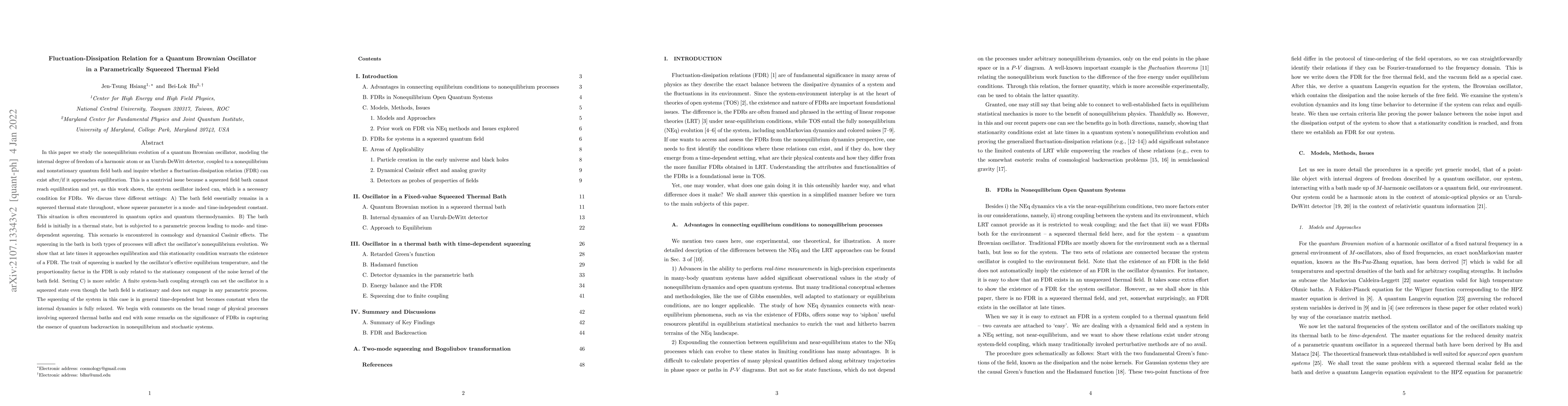 In this paper we study the nonequilibrium evolution of a quantum Brownian oscillator, modeling the internal degree of freedom of a harmonic atom or an Unruh-DeWitt detector, coupled to a nonequilibrium, nonstationary quantum field and inquire whether a fluctuation-dissipation relation can exist after/if it approaches equilibration. This is a nontrivial issue since a squeezed bath field cannot reach equilibration and yet, as this work shows, the system oscillator indeed can, which is a necessary condition for FDRs. We discuss three different settings: A) The bath field essentially remains in a squeezed thermal state throughout, whose squeeze parameter is a mode- and time-independent constant. This situation is often encountered in quantum optics and quantum thermodynamics. B) The field is initially in a thermal state, but subjected to a parametric process leading to mode- and time-dependent squeezing. This scenario is met in cosmology and dynamical Casimir effect. The squeezing in the bath in both types of processes will affect the oscillator's nonequilibrium evolution. We show that at late times it approaches equilibration, which warrants the existence of an FDR. The trait of squeezing is marked by the oscillator's effective equilibrium temperature, and the factor in the FDR is only related to the stationary component of bath's noise kernel. Setting C) is more subtle: A finite system-bath coupling strength can set the oscillator in a squeezed state even the bath field is stationary and does not engage in any parametric process. The squeezing of the system in this case is in general time-dependent but becomes constant when the internal dynamics is fully relaxed. We begin with comments on the broad range of physical processes involving squeezed thermal baths and end with some remarks on the significance of FDRs in capturing the essence of quantum backreaction in nonequilibrium systems.