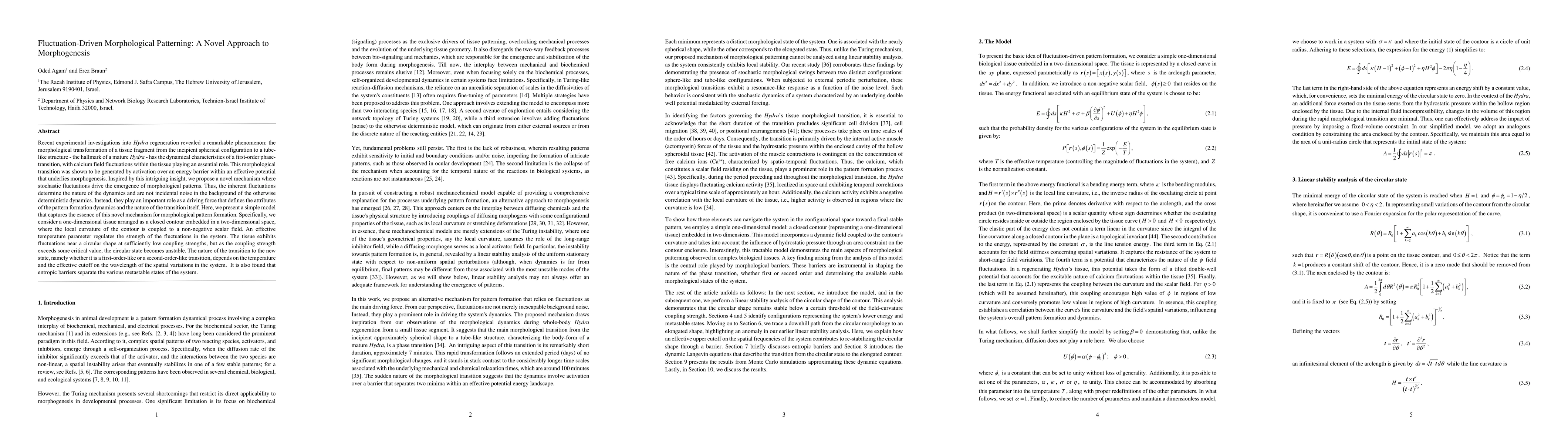 Recent experimental investigations into Hydra regeneration revealed a remarkable phenomenon: the morphological transformation of a tissue fragment from the incipient spherical configuration to a tube-like structure - the hallmark of a mature Hydra - has the dynamical characteristics of a first-order phase-transition, with calcium field fluctuations within the tissue playing an essential role. This morphological transition was shown to be generated by activation over an energy barrier within an effective potential that underlies morphogenesis. Inspired by this intriguing insight, we propose a novel mechanism where stochastic fluctuations drive the emergence of morphological patterns. Thus, the inherent fluctuations determine the nature of the dynamics and are not incidental noise in the background of the otherwise deterministic dynamics. Instead, they play an important role as a driving force that defines the attributes of the pattern formation dynamics and the nature of the transition itself. Here, we present a simple model that captures the essence of this novel mechanism for morphological pattern formation. Specifically, we consider a one-dimensional tissue arranged as a closed contour embedded in a two-dimensional space, where the local curvature of the contour is coupled to a non-negative scalar field. An effective temperature parameter regulates the strength of the fluctuations in the system. The tissue exhibits fluctuations near a circular shape at sufficiently low coupling strengths, but as the coupling strength exceeds some critical value, the circular state becomes unstable. The nature of the transition, namely whether it is a first or a second-order-like transition, depends on the temperature and the effective cutoff on the wavelength of the spatial variations in the system. It is also found that entropic barriers separate the various metastable states of the system.