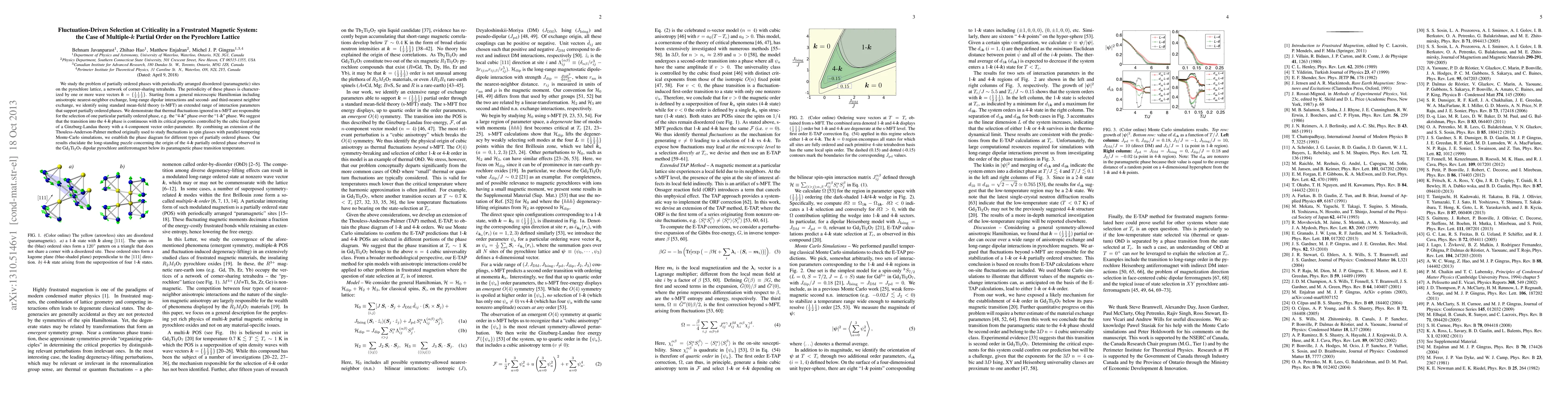 We study the problem of partially ordered phases with periodically arranged disordered (paramagnetic) sites on the pyrochlore lattice, a network of corner-sharing tetrahedra. The periodicity of these phases is characterized by one or more wave vectors k=(1/2 1/2 1/2). Starting from a general microscopic Hamiltonian including anisotropic nearest-neighbor exchange, long-range dipolar interactions and second- and third-nearest neighbor exchange, we identify using standard mean-field theory (s-MFT) an extended range of interaction parameters that support partially ordered phases. We demonstrate that thermal fluctuations ignored in s-MFT are responsible for the selection of one particular partially ordered phase, e.g. the "4-k" phase over the "1-k" phase. We suggest that the transition into the 4-k phase is continuous with its critical properties controlled by the cubic fixed point of a Ginzburg-Landau theory with a 4-component vector order-parameter. By combining an extension of the Thouless-Anderson-Palmer method originally used to study fluctuations in spin glasses with parallel-tempering Monte-Carlo simulations, we establish the phase diagram for different types of partially ordered phases. Our results elucidate the long-standing puzzle concerning the origin of the 4-k partially ordered phase observed in the Gd2Ti2O7 dipolar pyrochlore antiferromagnet below its paramagnetic phase transition temperature.