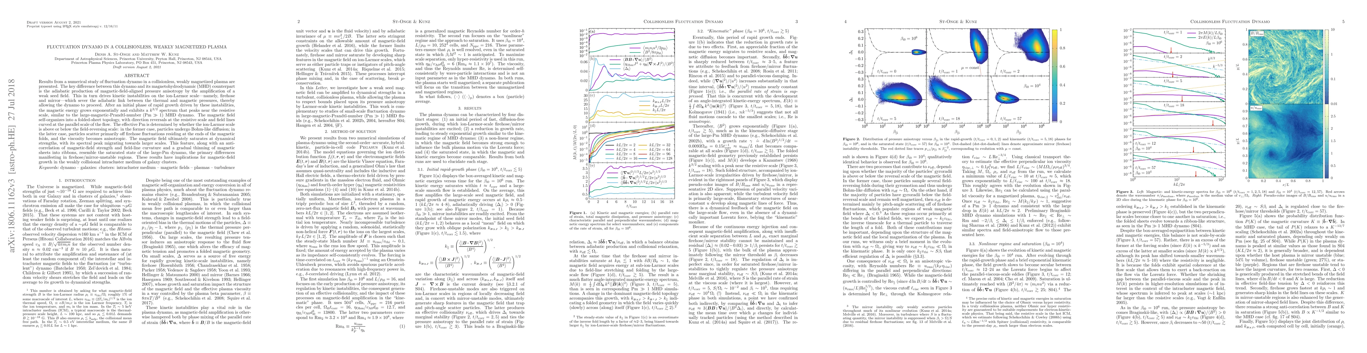 This paper investigates a fluctuation dynamo in collisionless, weakly magnetized plasma, highlighting the role of kinetic instabilities in amplifying magnetic fields. The study finds that magnetic energy grows exponentially and self-organizes into folded sheets, resembling the large-magnetic-Prandtl-number MHD dynamo, with implications for magnetic field growth in galaxy clusters.