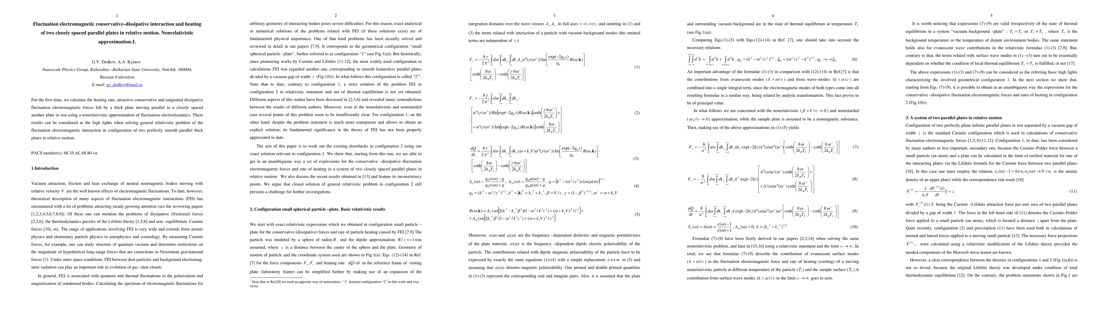 This paper calculates the heating rate and electromagnetic forces between two parallel plates in relative motion, using a nonrelativistic approximation. The findings provide insights into the conservative and dissipative interactions that occur, paving the way for future general relativistic analyses.