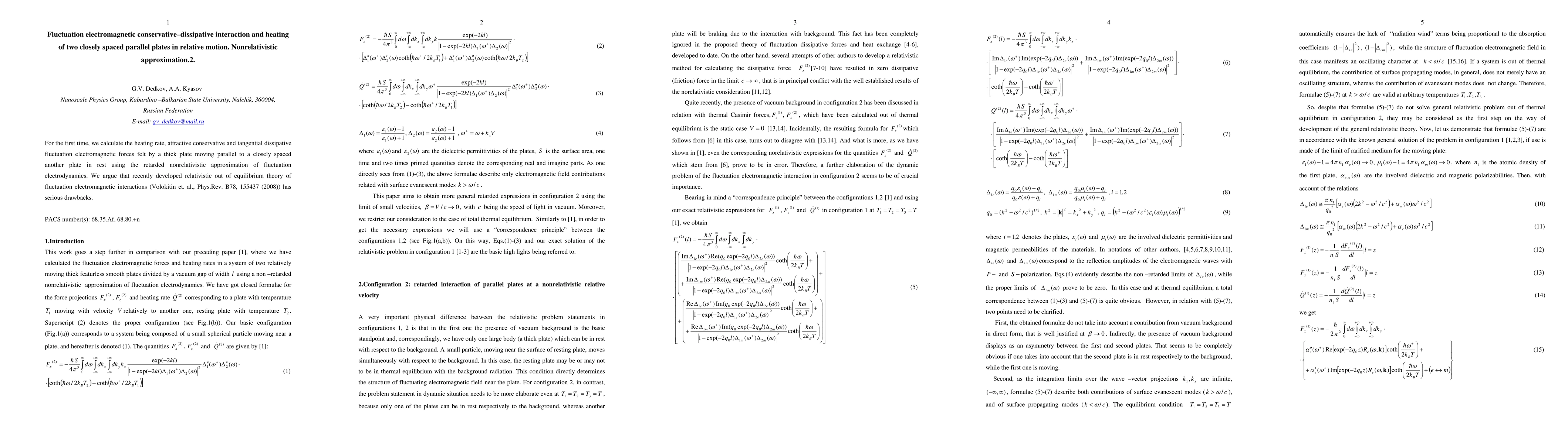 For the first time, we calculate the heating rate, attractive conservative and tangential dissipative fluctuation electromagnetic forces felt by a thick plate moving parallel to a closely spaced another plate in rest using the retarded nonrelativistic approximation of fluctuation electrodynamics. We argue that recently developed relativistic out of equilibrium theory of fluctuation electromagnetic interactions (Volokitin et. al., Phys.Rev. B78, 155437 (2008)) has serious drawbacks.