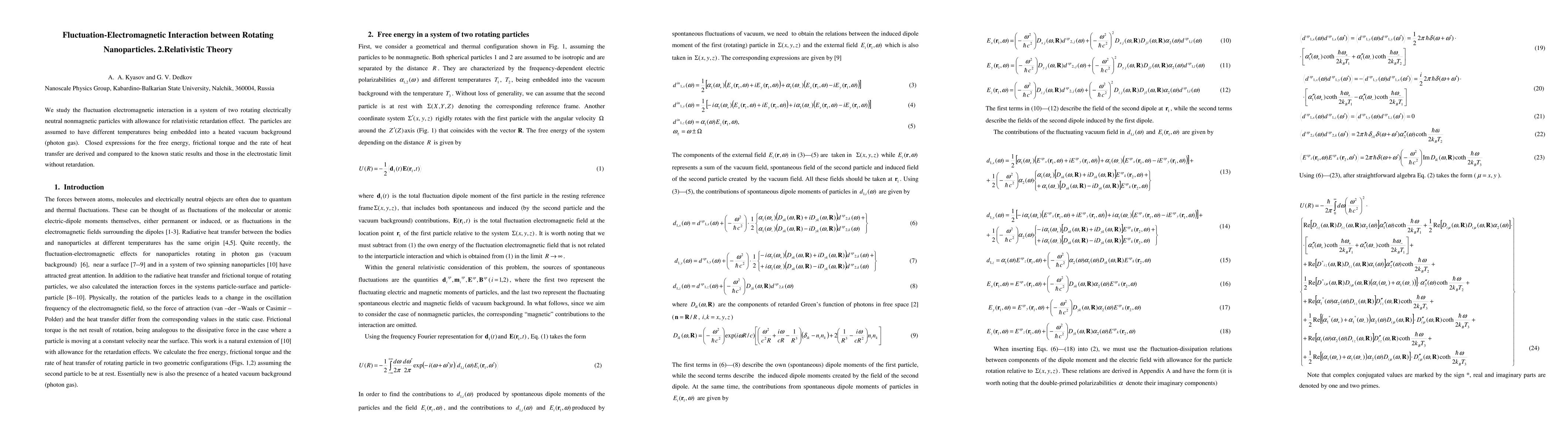 This paper investigates the fluctuation electromagnetic interaction between two rotating, electrically neutral, nonmagnetic nanoparticles, considering relativistic effects and different temperatures in a heated vacuum. It derives expressions for free energy, frictional torque, and heat transfer rate, comparing them to static and electrostatic limits.