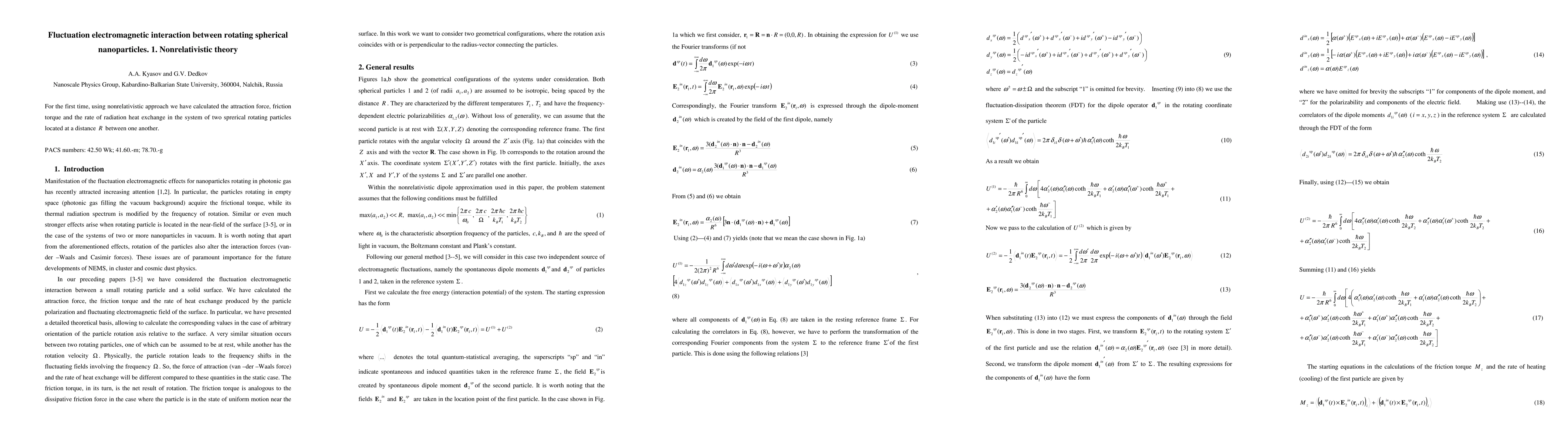 For the first time, using nonrelativistic approach we have calculated the attraction force, friction torque and the rate of radiation heat exchange in the system of two sprerical rotating particles located at a distance between one another.